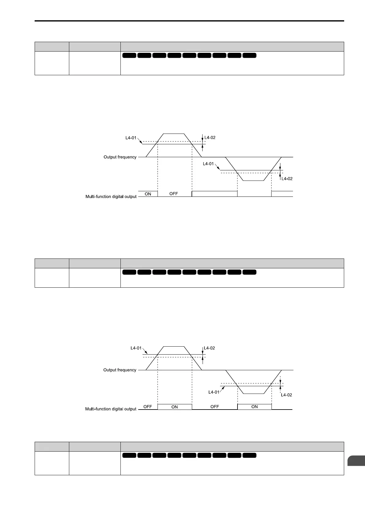 The terminal deactivates when the output frequency is higher than the setting value of “L4-03 [SpAgree Det.Level(+/-)] + L4-04