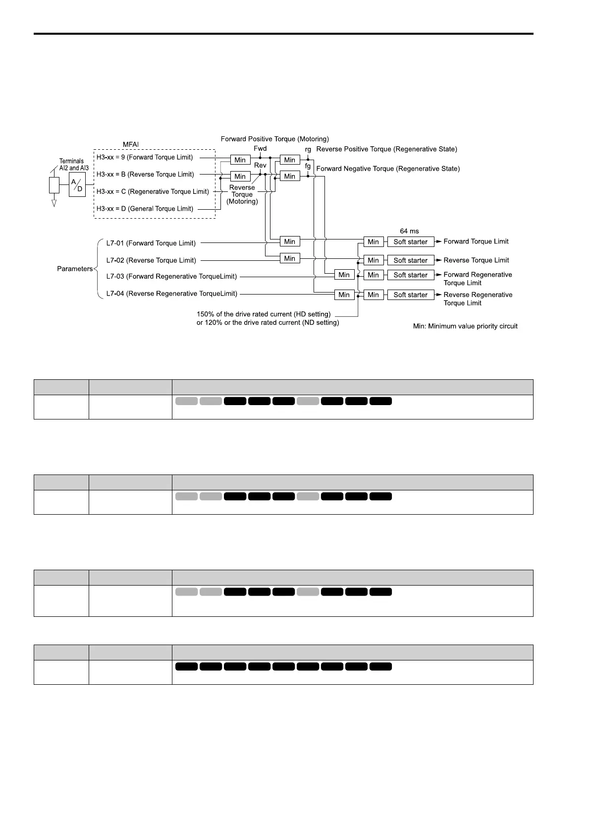 When you use L7-01 to L7-04 and analog inputs to set torque limits for the same quadrant, it will enable the lower torque limit.