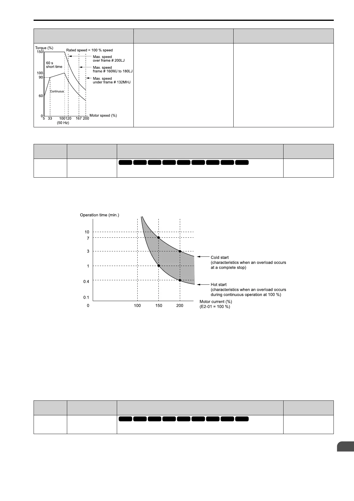 Shows the motor protection operation time characteristics when overload occurs from continuous operation