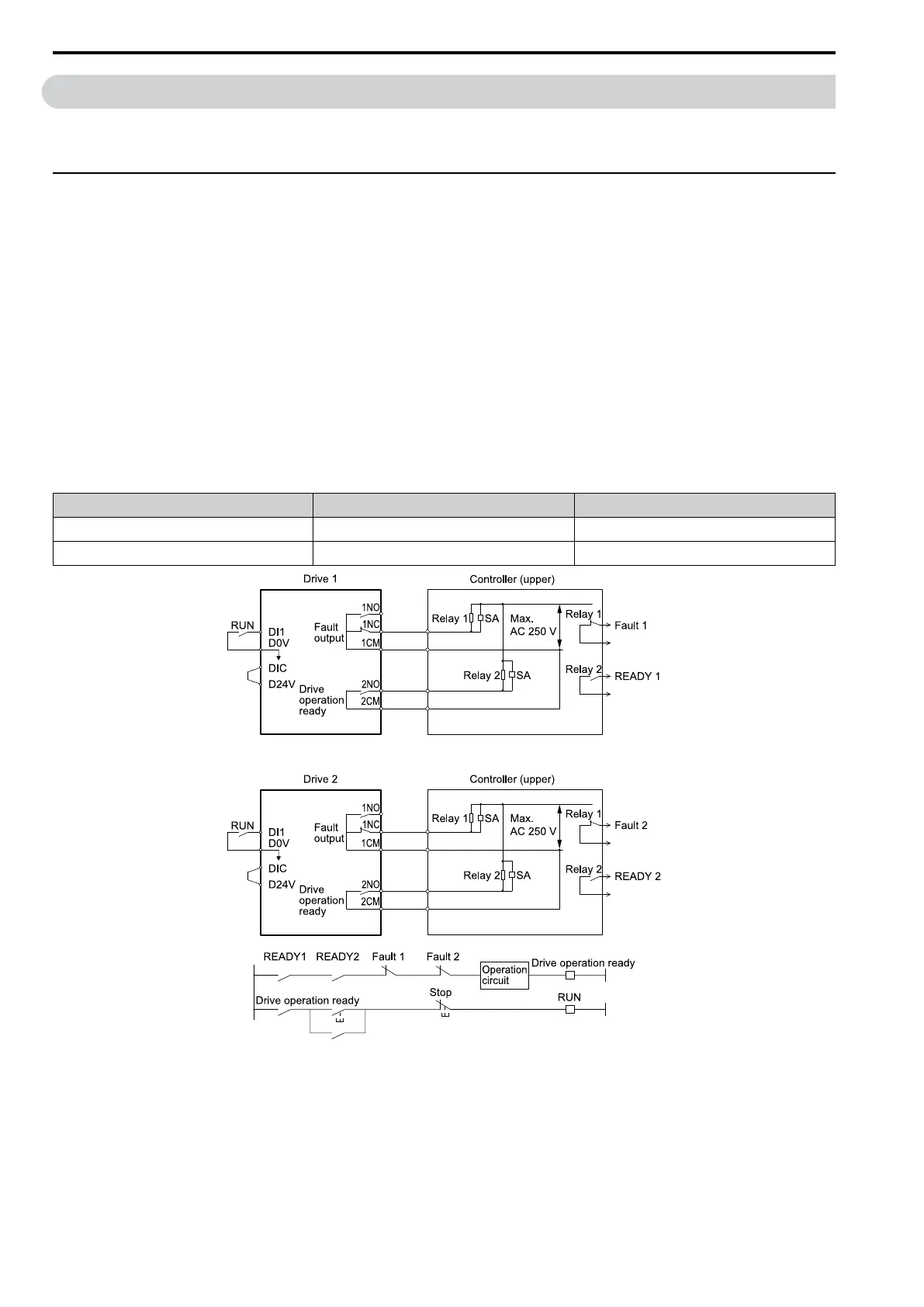 This is an example of how two drives that run one application use the Drive Ready and Fault output signals to