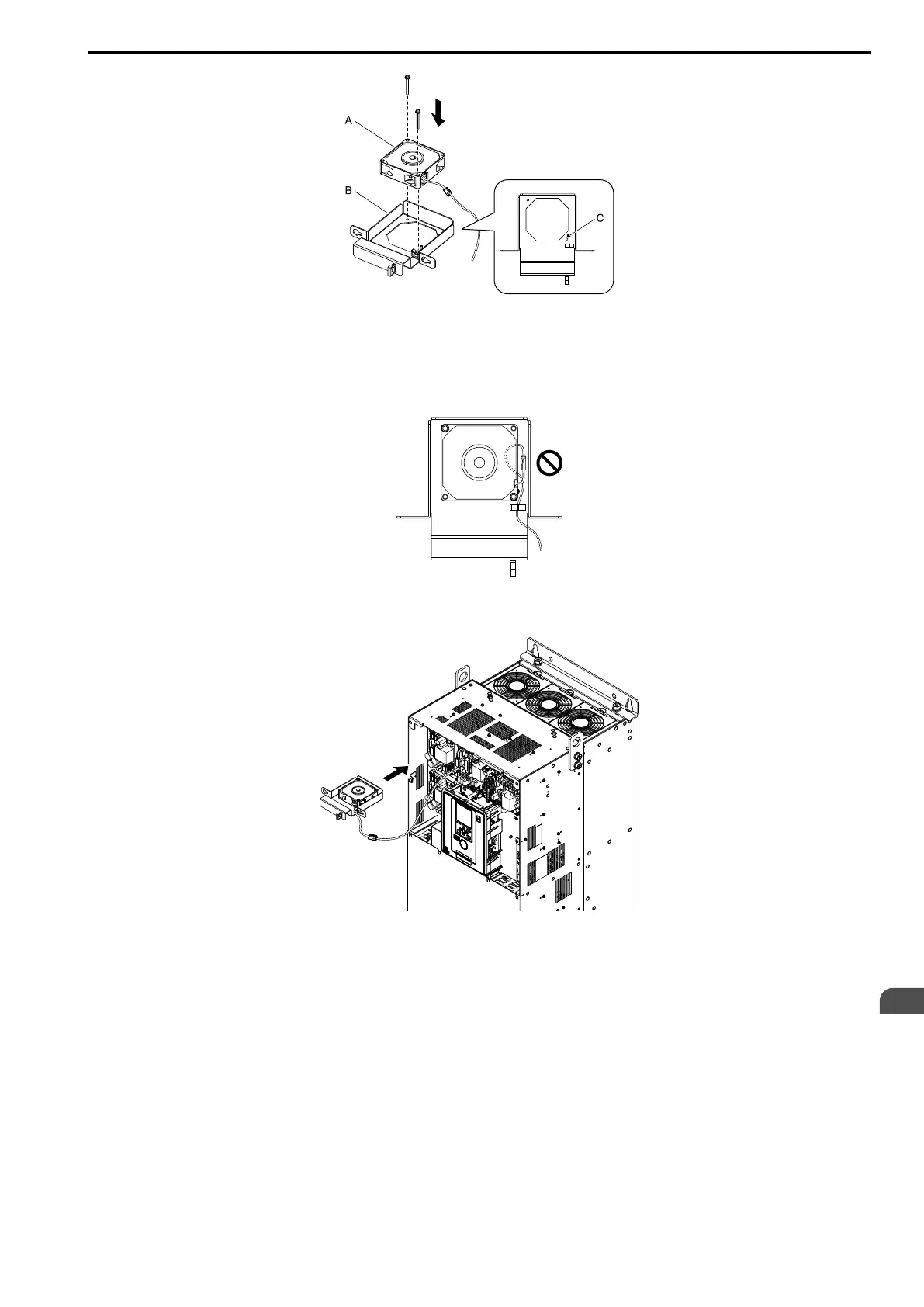 When you install the cooling fan, make sure that you do not pinch cables between the cooling fan and the fan unit base.