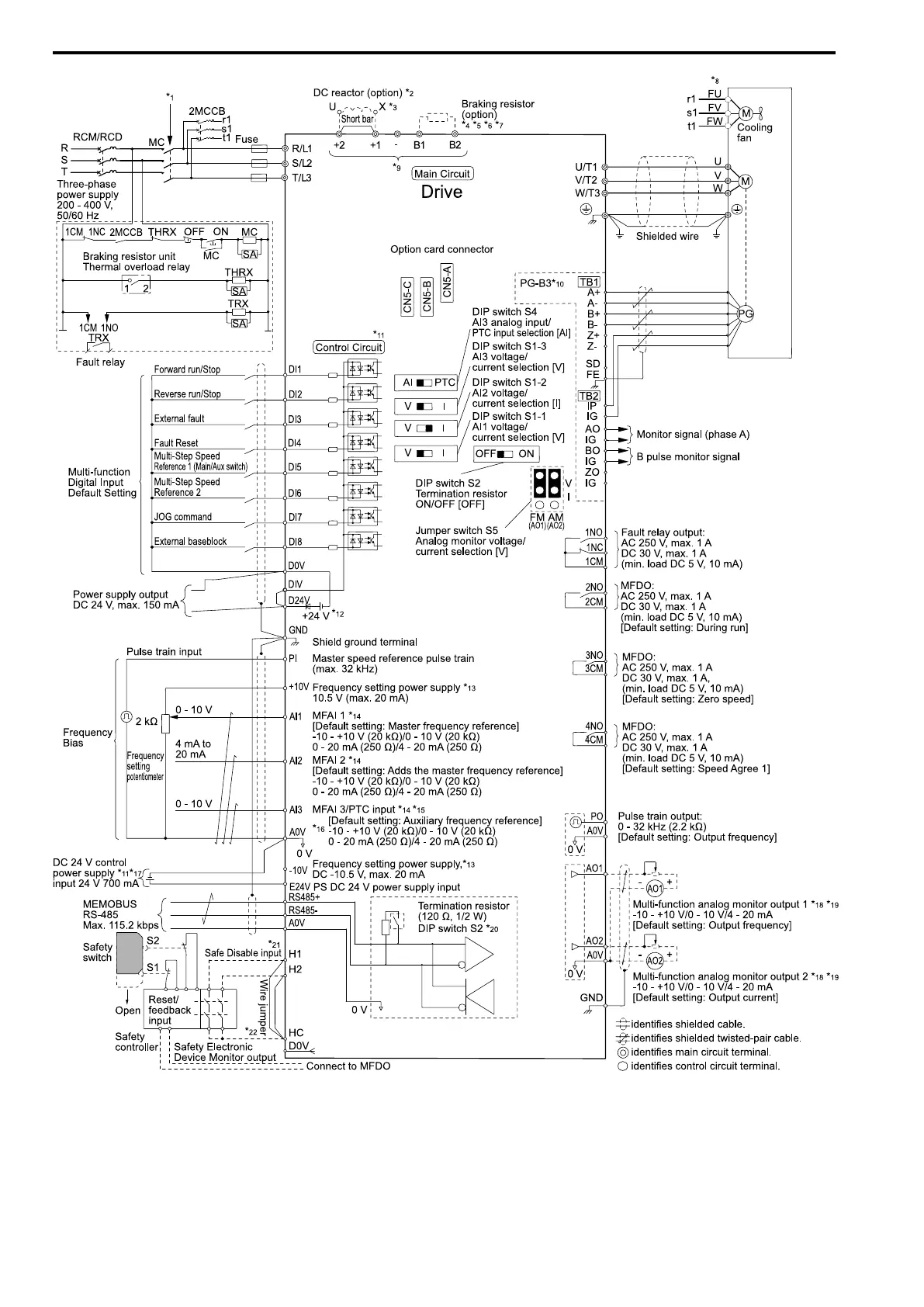 *1 Set the wiring sequence to de-energize the drive with the fault relay output. If the drive outputs a fault during