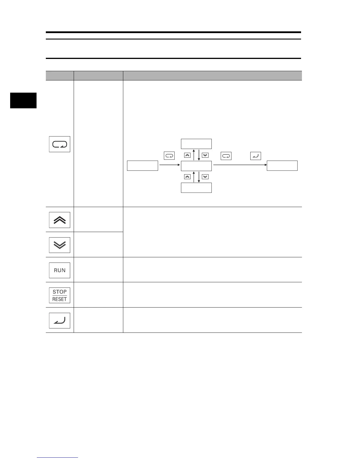 RUN key Starts the operation. Forward/Reverse rotation depends on the "F004" setting.