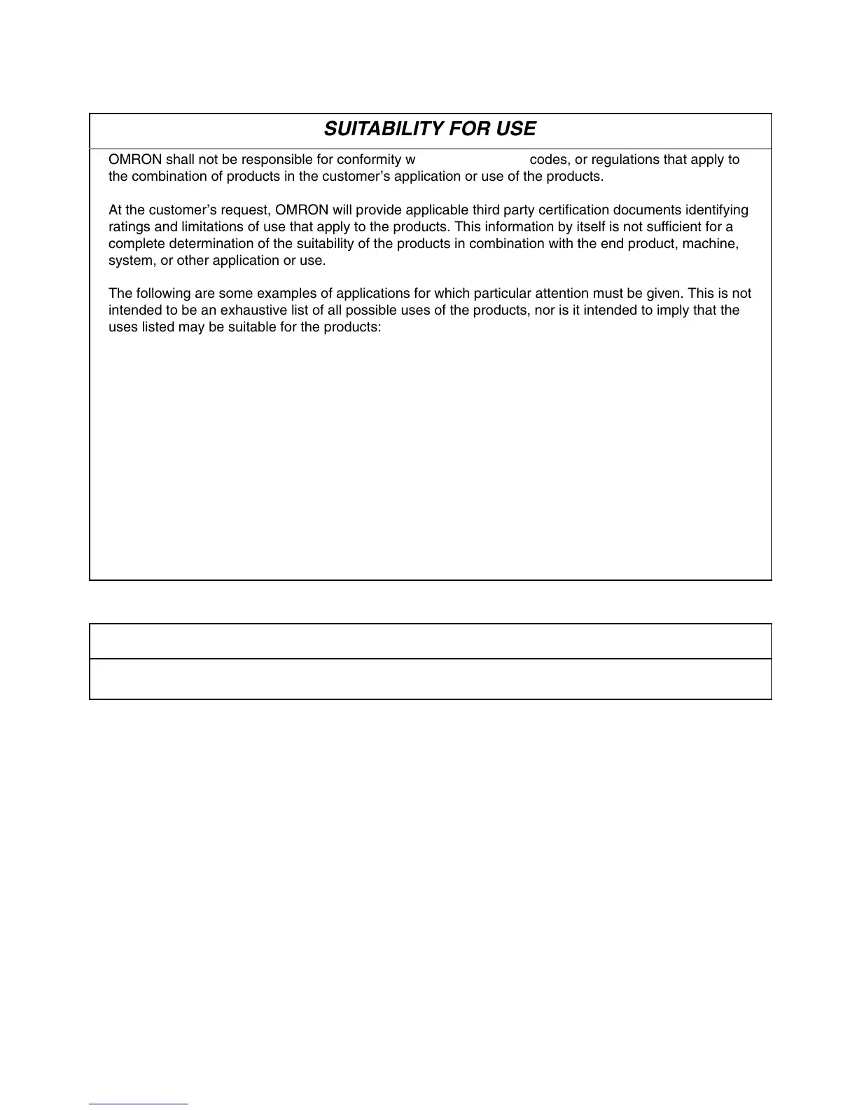 OMRON shall not be responsible for conformity with any standards, codes, or regulations that apply to