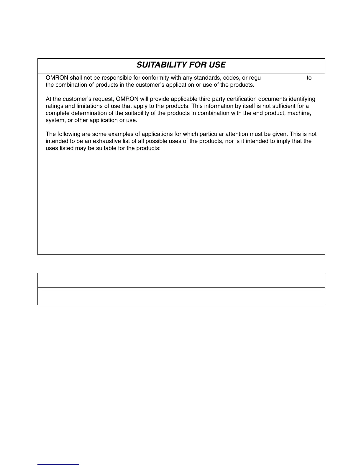 OMRON shall not be responsible for conformity with any standards, codes, or regulations that apply to