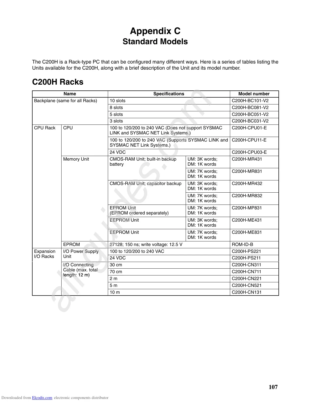 Units available for the C200H, along with a brief description of the Unit and its model number.