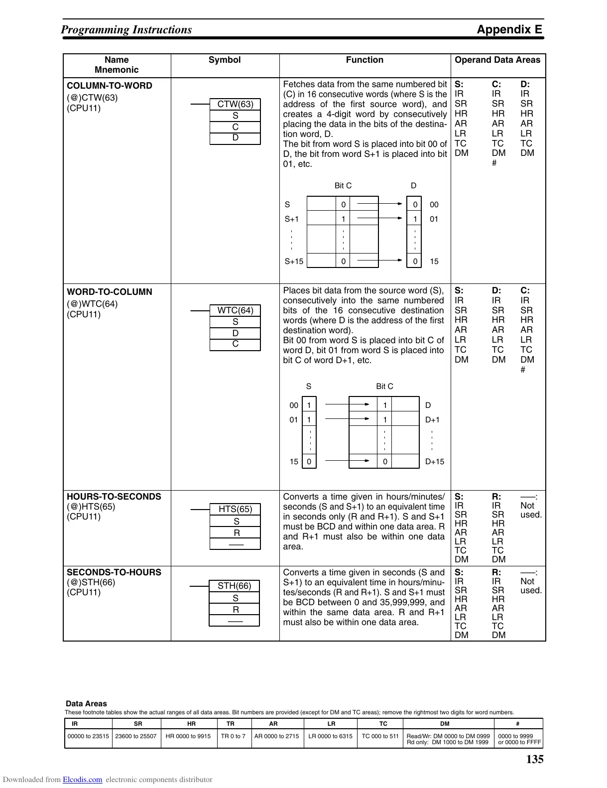These footnote tables show the actual ranges of all data areas. Bit numbers are provided (except for DM and TC areas); remove the rightmost two digits for word numbers.