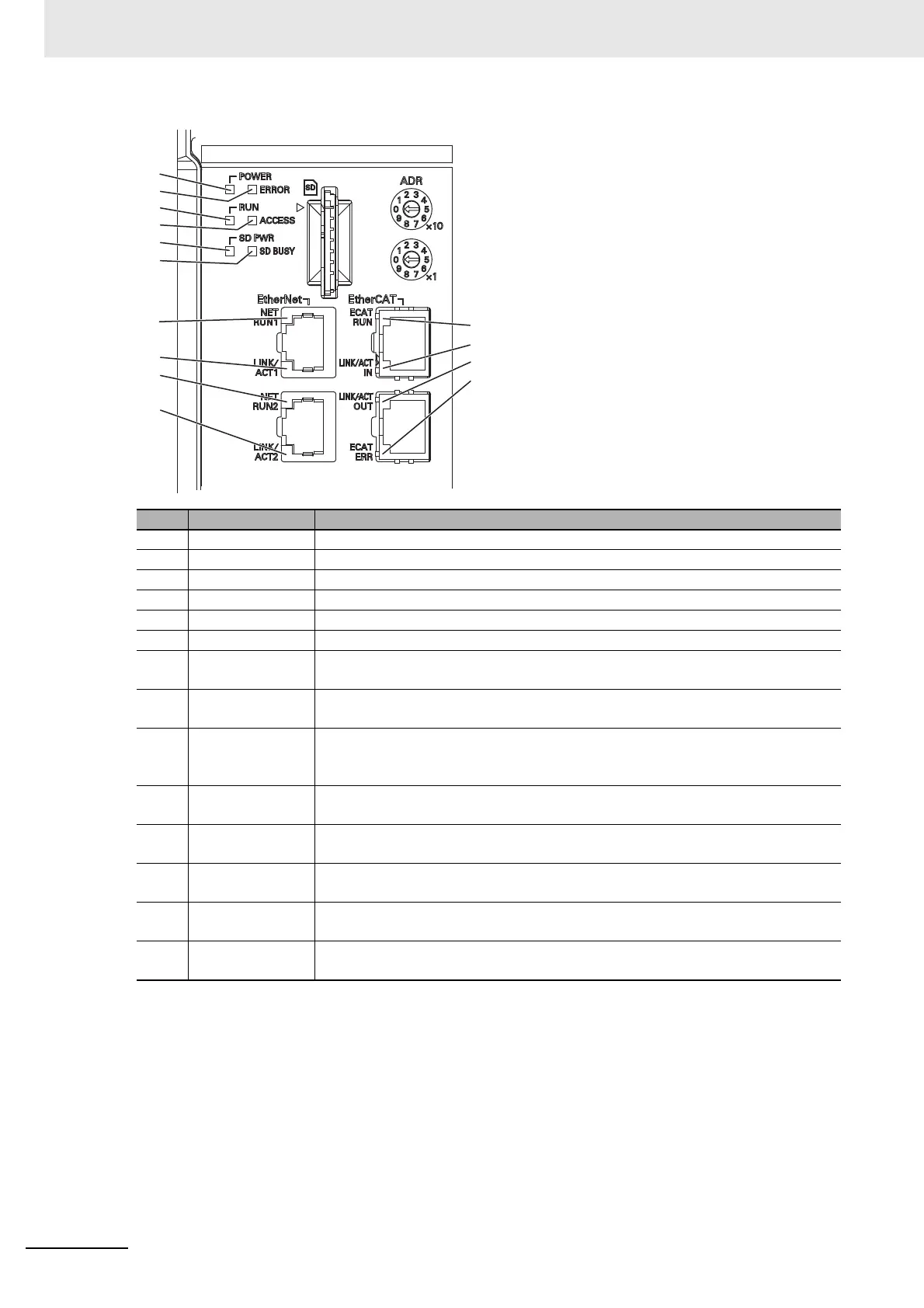 Lit when connected with an EtherCAT device, and blinks while performing commu-