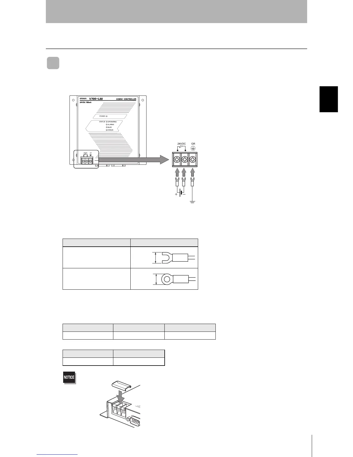 The terminal screws on the terminal block are M3 size. Use appropriate crimp terminals for M3 screws