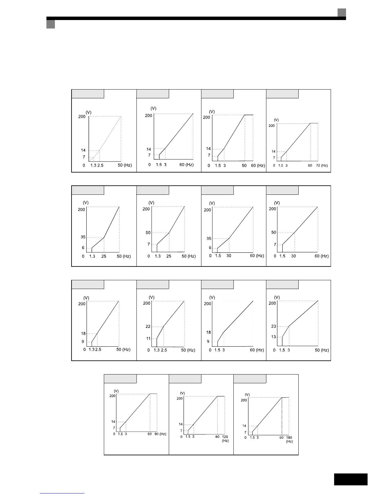 The diagrams show characteristics for a 200 V class Inverter. For a 400 V class Inverter, multiply all voltages