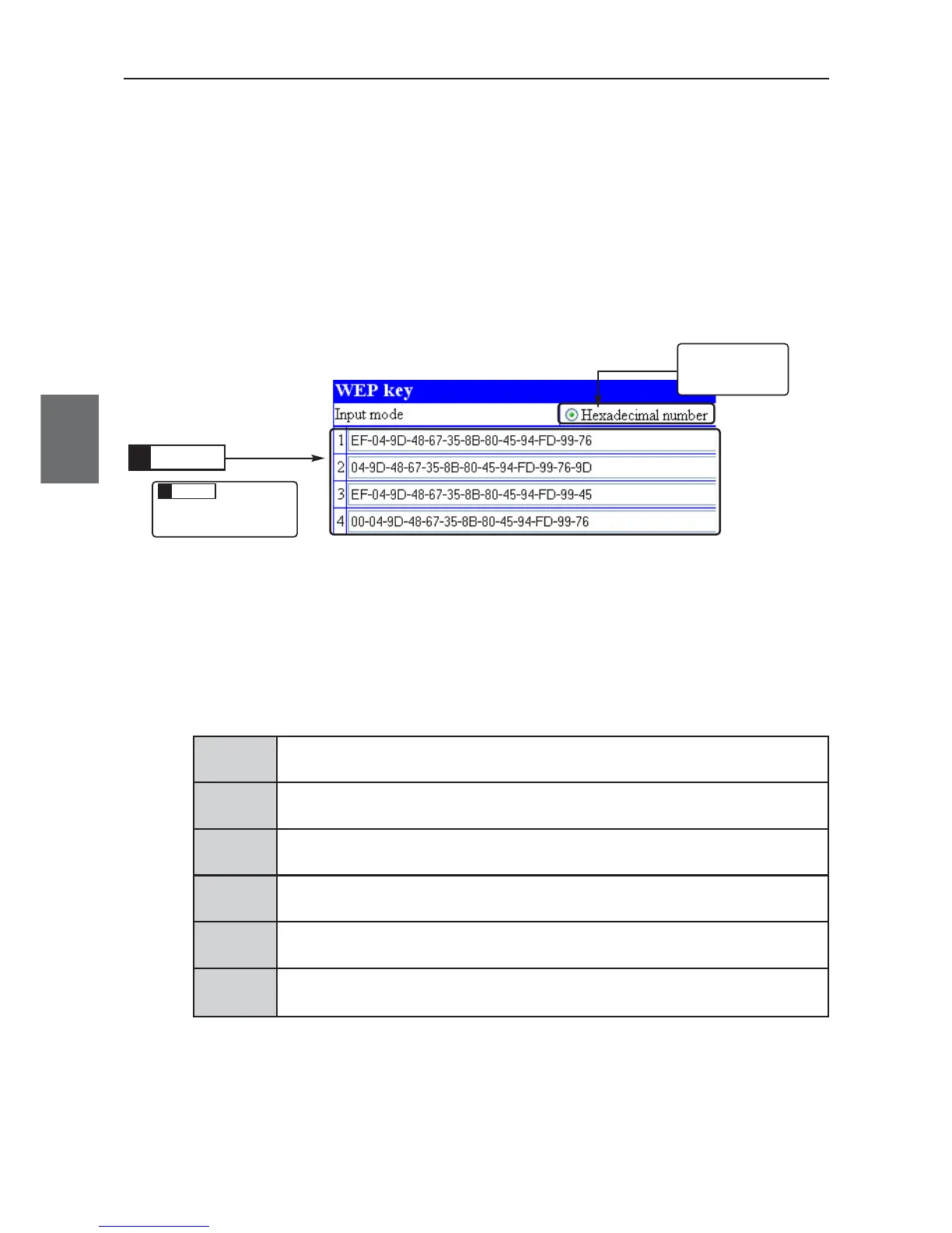 (3) Enter WEP key in text boxes from 1 to 4 of Key index using hexadecimal