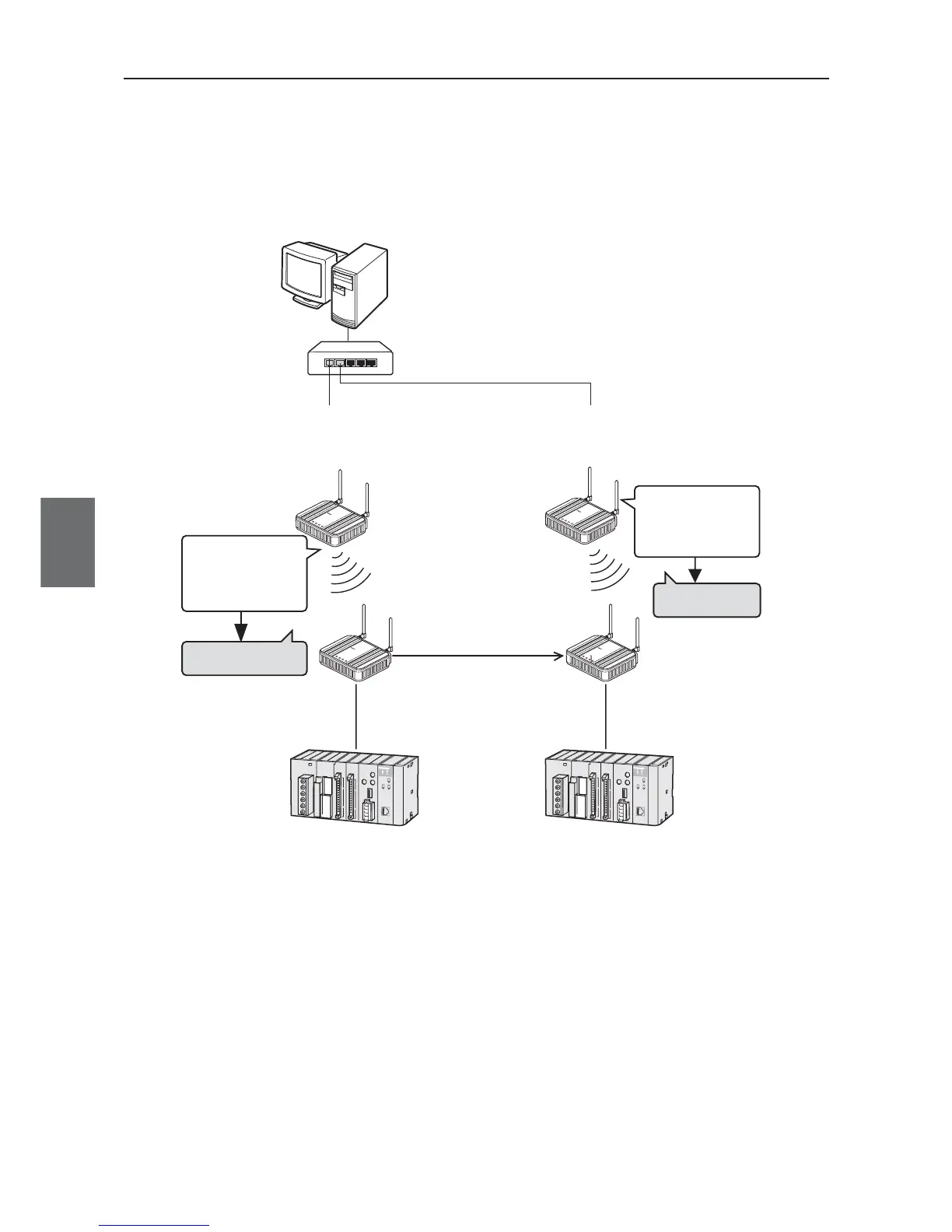 access point. If there are 2 access points, connect PC, hub, wireless units, and PLC as shown below.