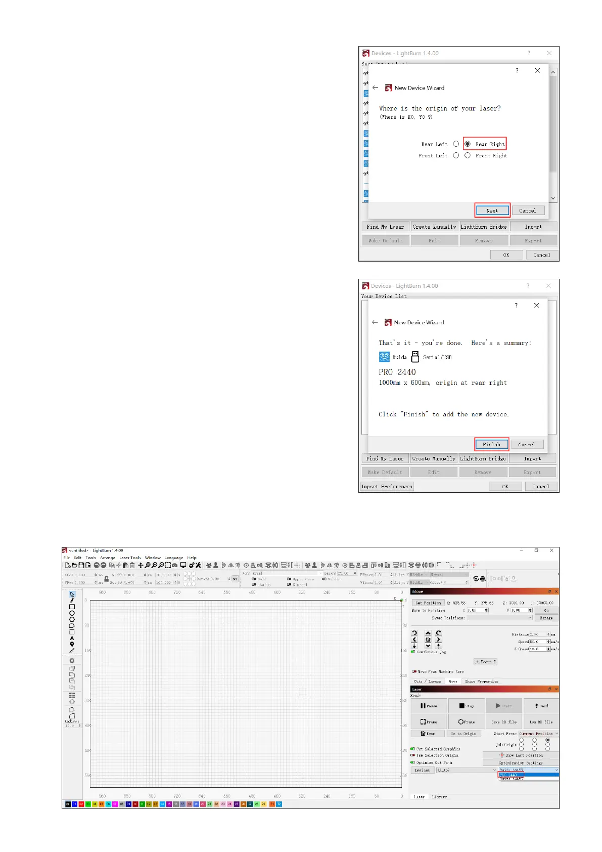 9. Click the device drop list in the lower right corner and choose “PRO 2440”. The engraver is connected when the