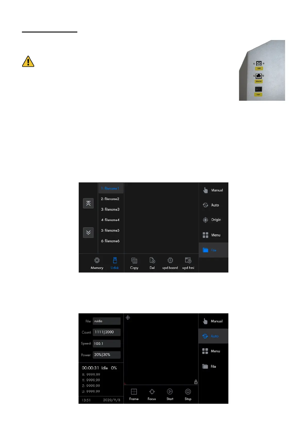 The, X+, X–, Y+, and Y– icons in the manual menu can be used to move the laser head along the X and Y-axis guide