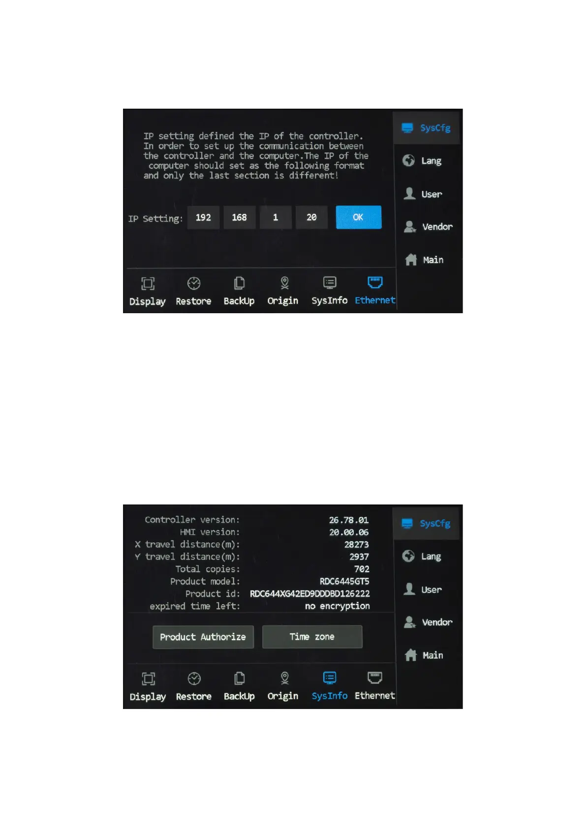 Tapping “SysInfo” accesses the system information menu, where the product activation and time zone can be set.