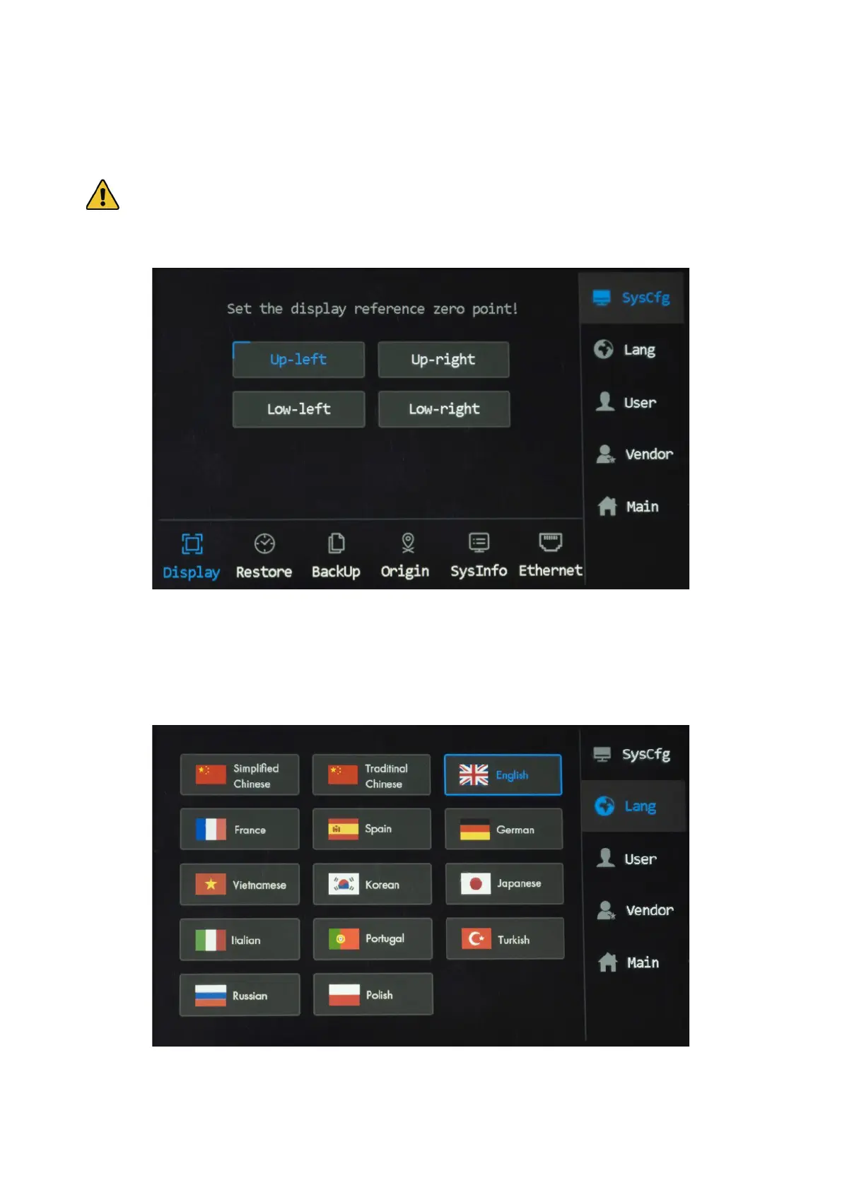 1. Tap Menu>Lang, and the menu as shown shows up.