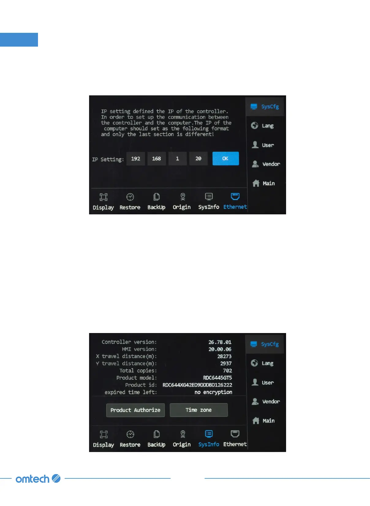 This menu includes SysCfg, Lang, User, Vendor, and Main.