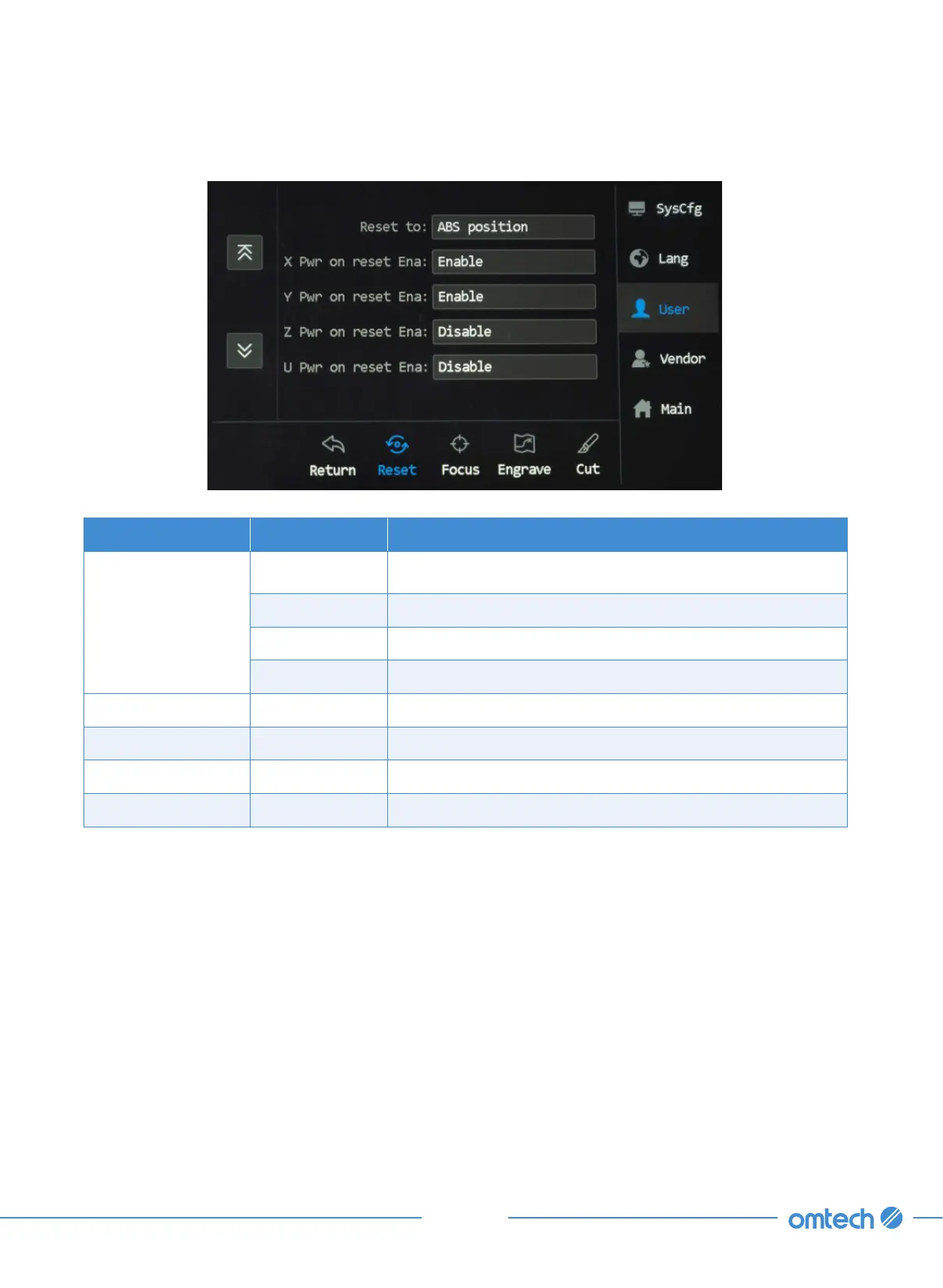 Z Pwr on reset Ena Enable/Disable Sets the laser head to its Z origin upon powering up.