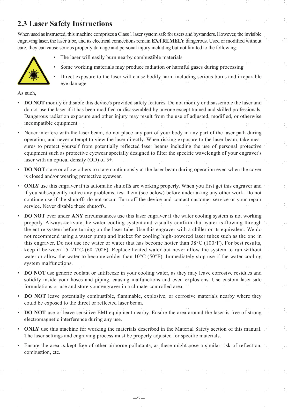 • DO NOT ever under ANY circumstances use this laser engraver if the water cooling system is not working
