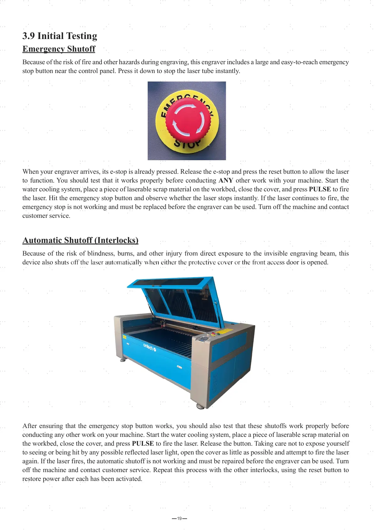 the laser. Hit the emergency stop button and observe whether the laser stops instantly. If the laser continues to fire, the