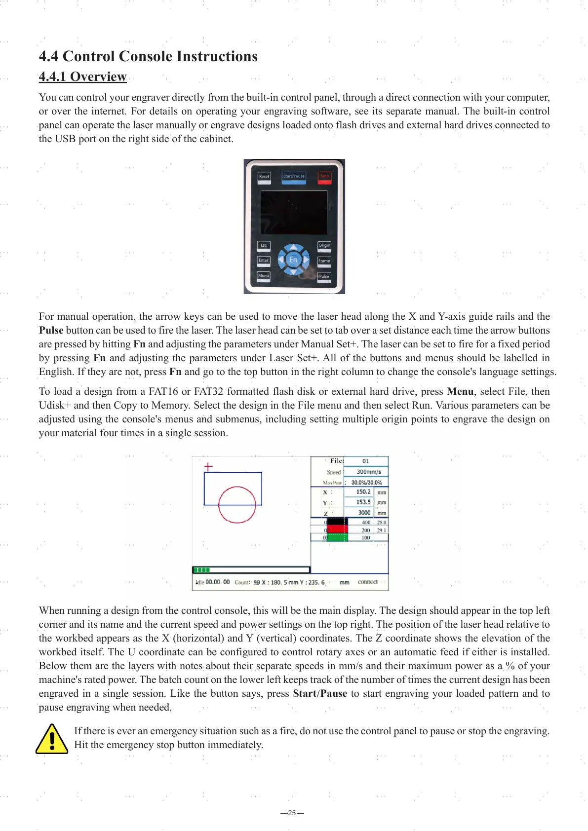 If there is ever an emergency situation such as a fire, do not use the control panel to pause or stop the engraving.