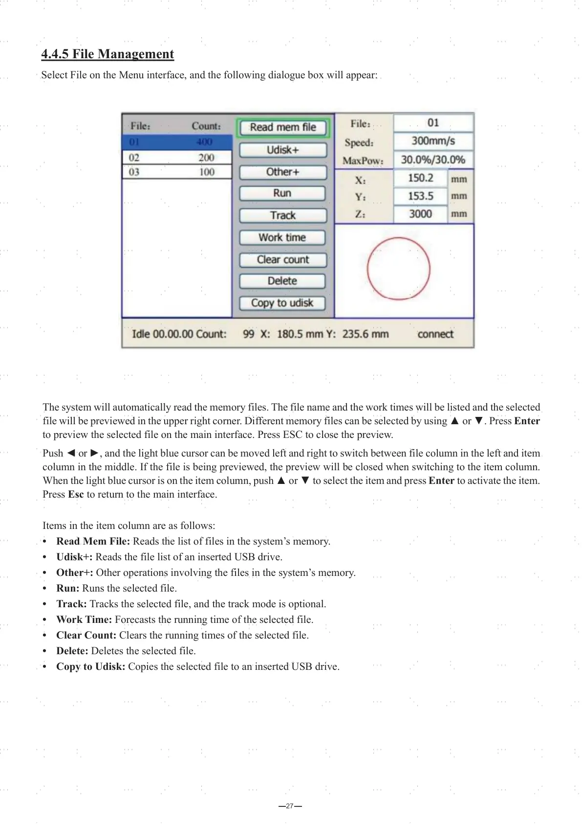 The system will automatically read the memory files. The file name and the work times will be listed and the selected