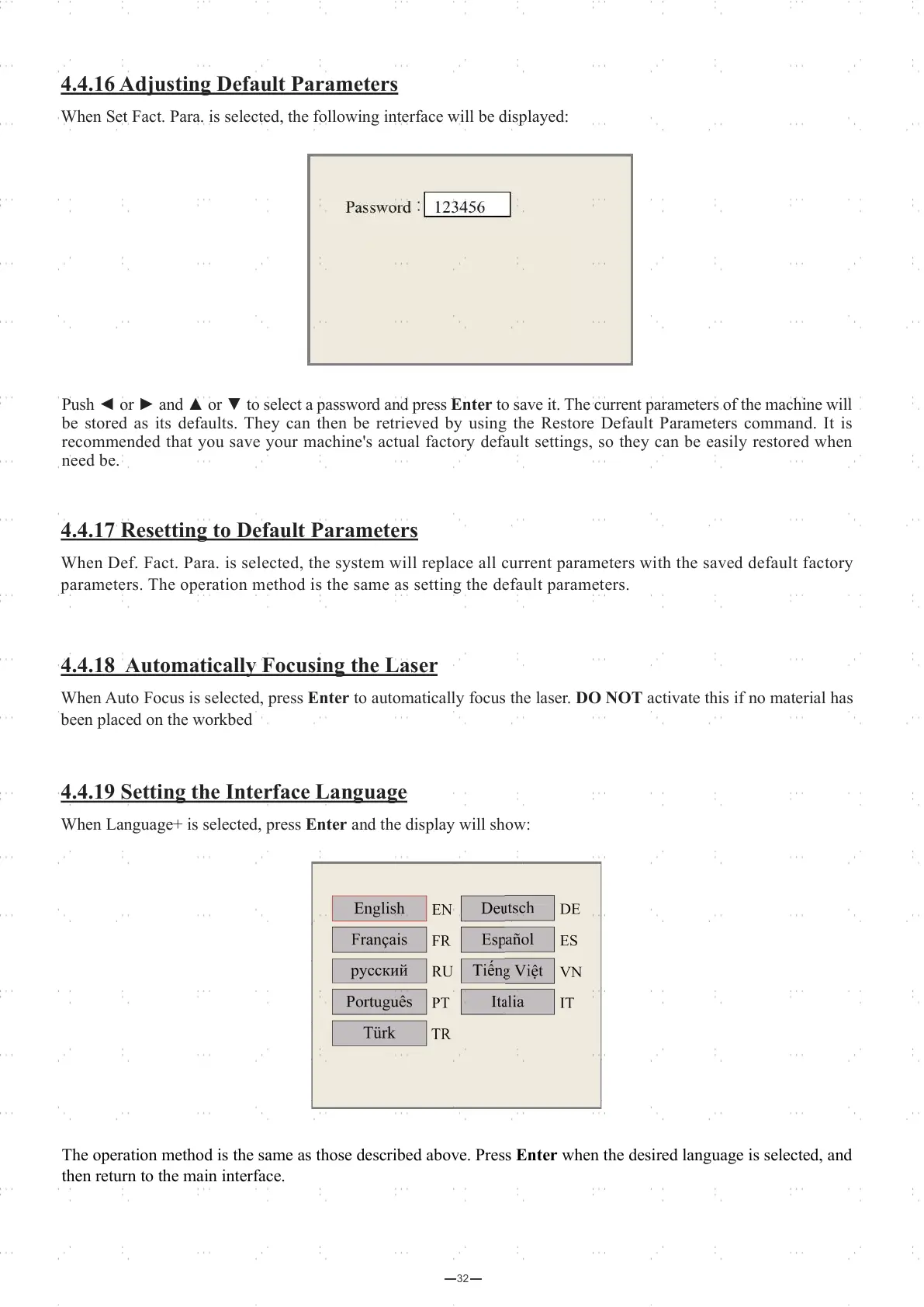 When Def. Fact. Para. is selected, the system will replace all current parameters with the saved default factory