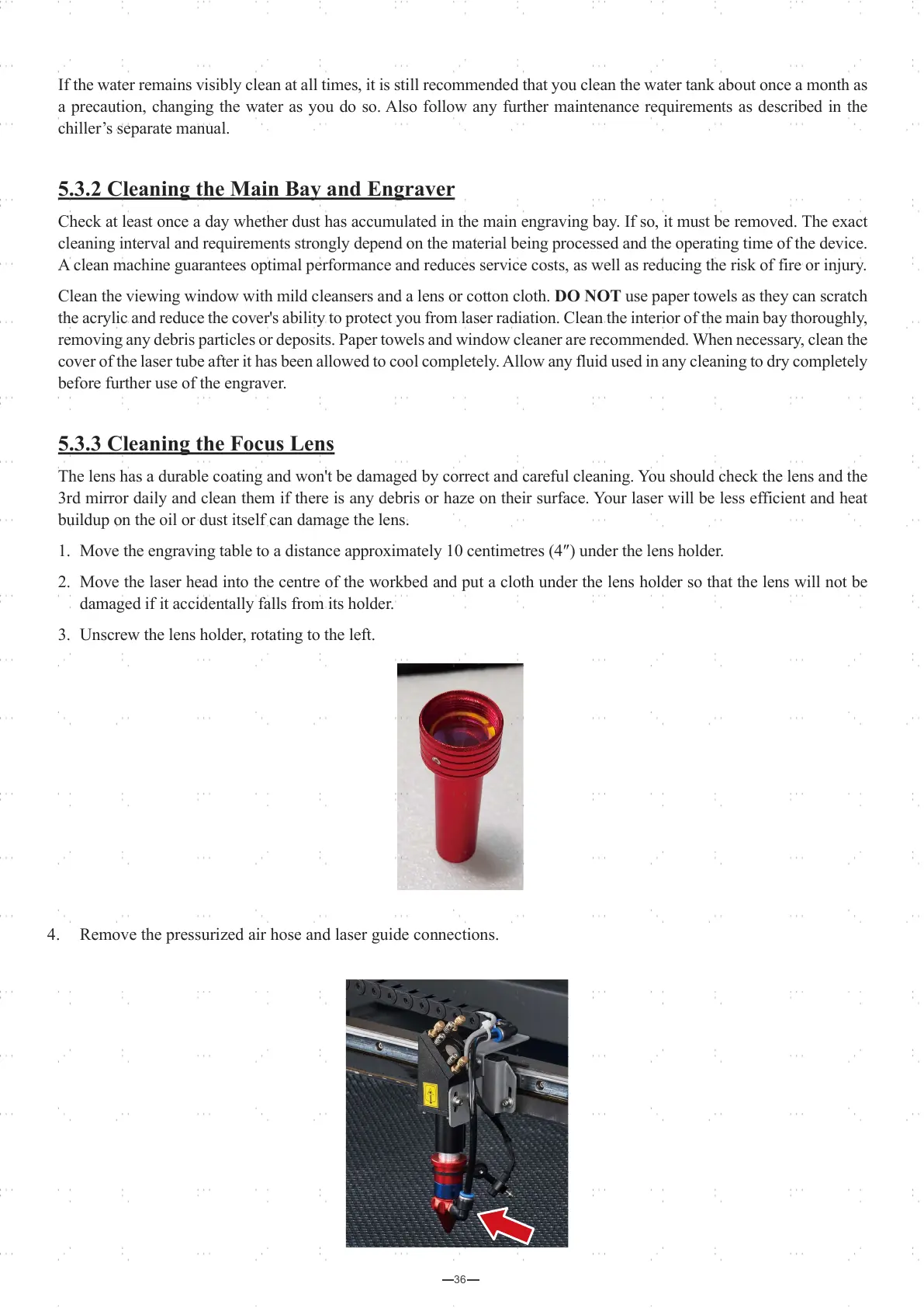 cover of the laser tube after it has been allowed to cool completely. Allow any fluid used in any cleaning to dry completely