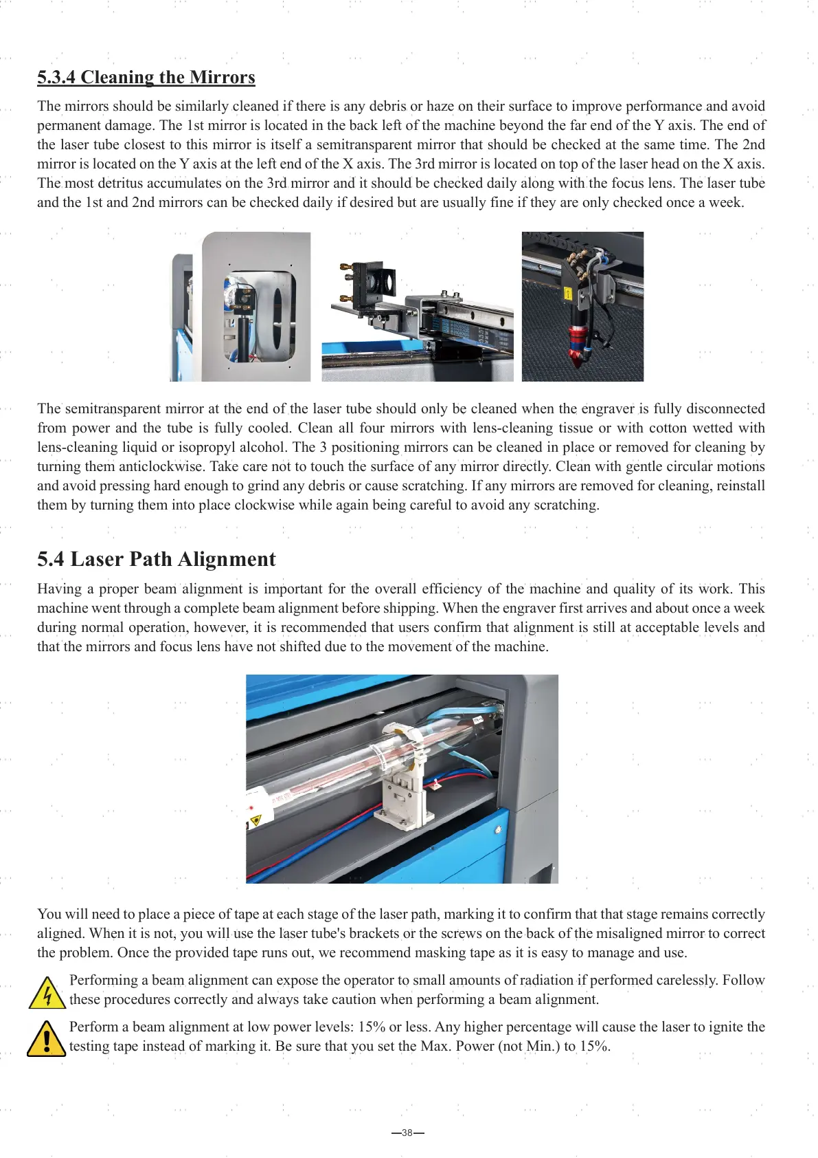 The semitransparent mirror at the end of the laser tube should only be cleaned when the engraver is fully disconnected