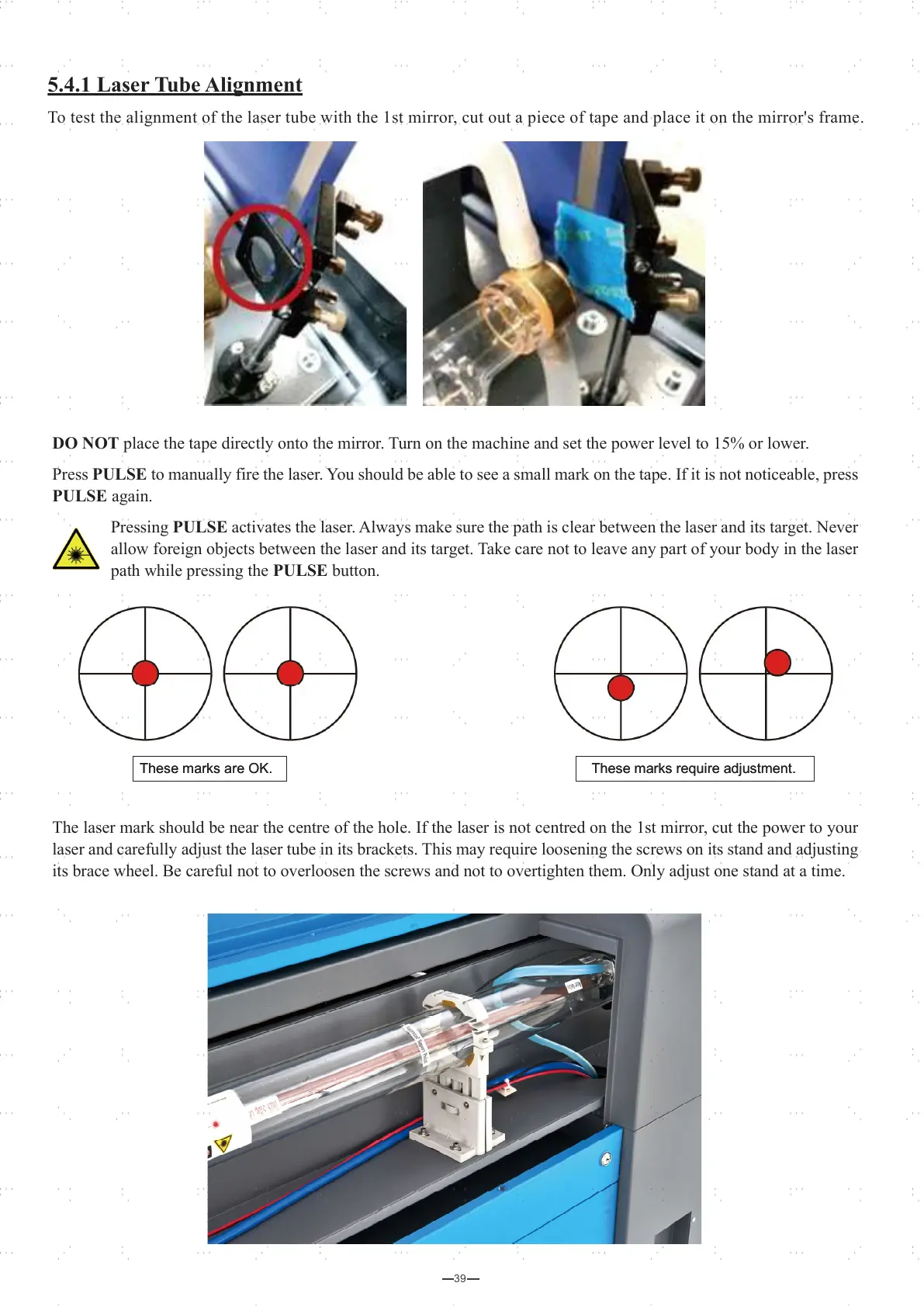 laser and carefully adjust the laser tube in its brackets. This may require loosening the screws on its stand and adjusting
