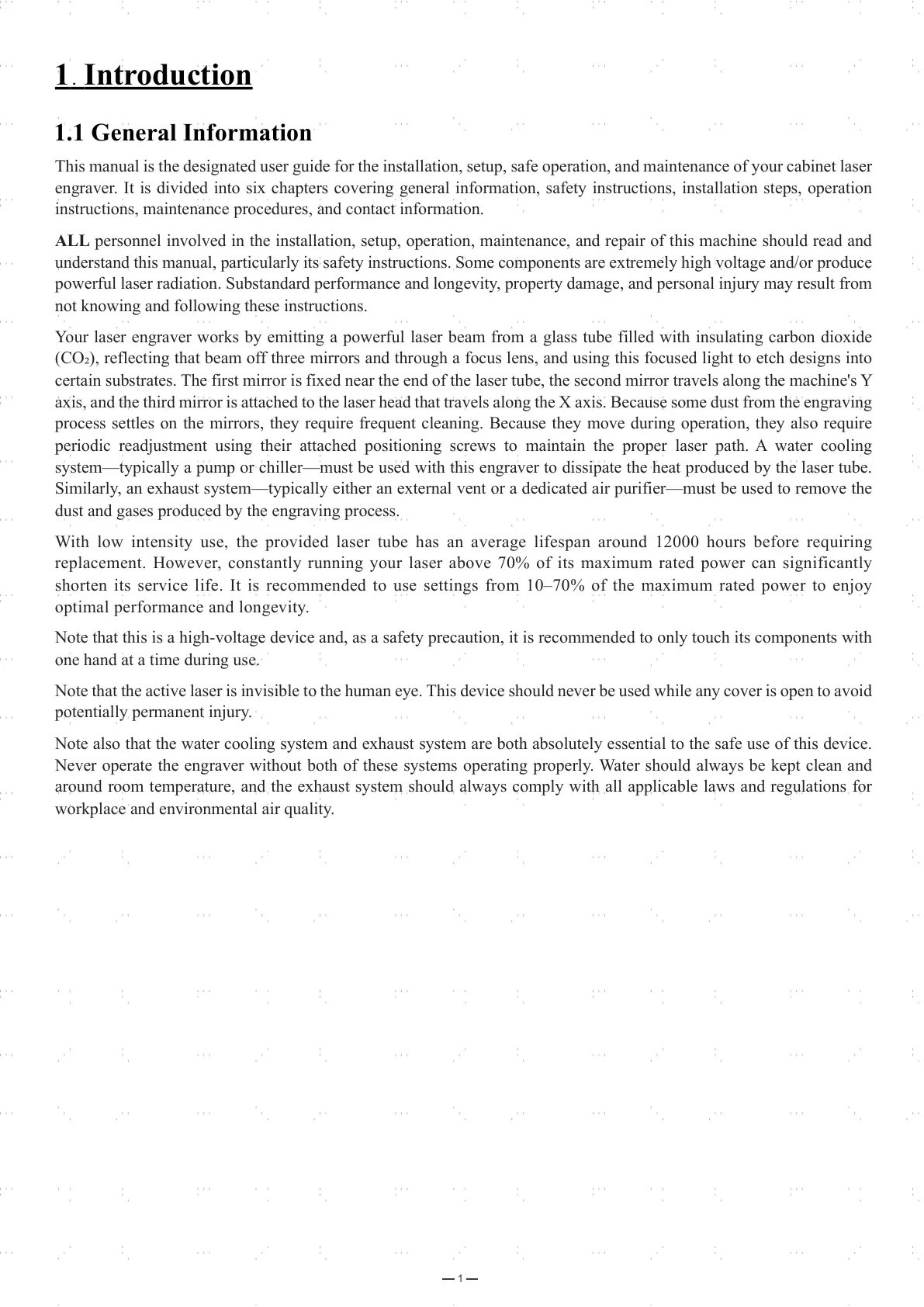 This manual is the designated user guide for the installation, setup, safe operation, and maintenance of your cabinet laser