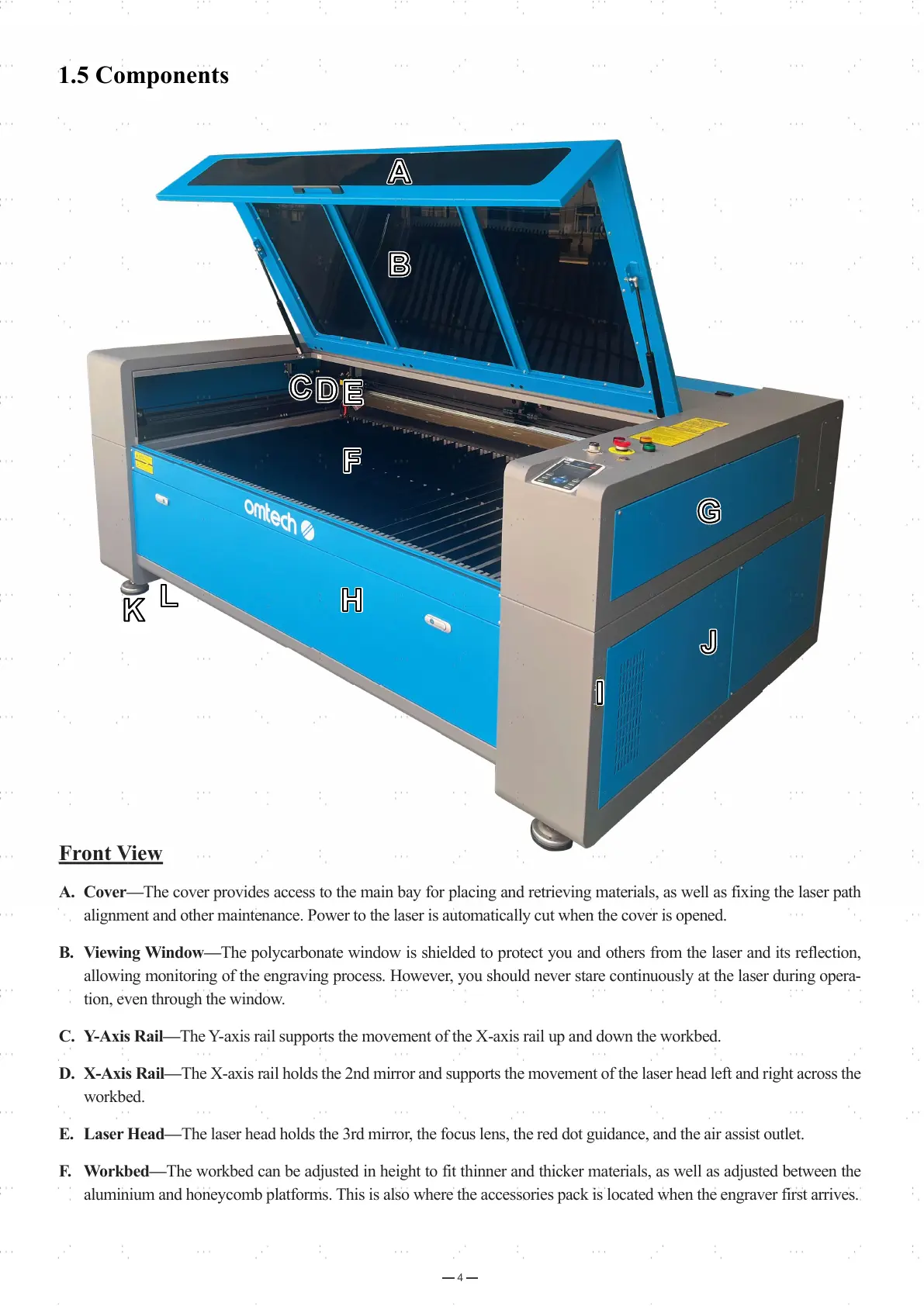 A. Cover—The cover provides access to the main bay for placing and retrieving materials, as well as fixing the laser path