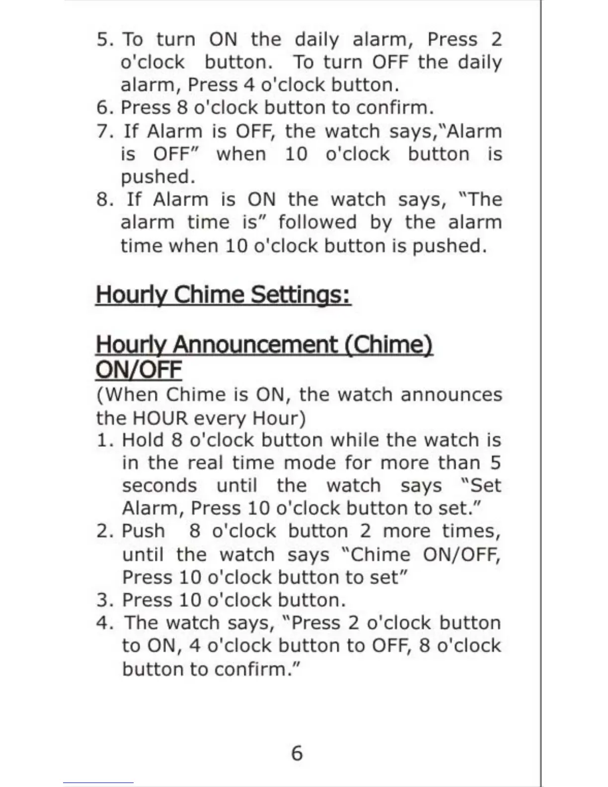 On Time 101006 Talking Atomic Watch - Hourly Chime Settings; Hourly Announcement (Chime) ON;OFF