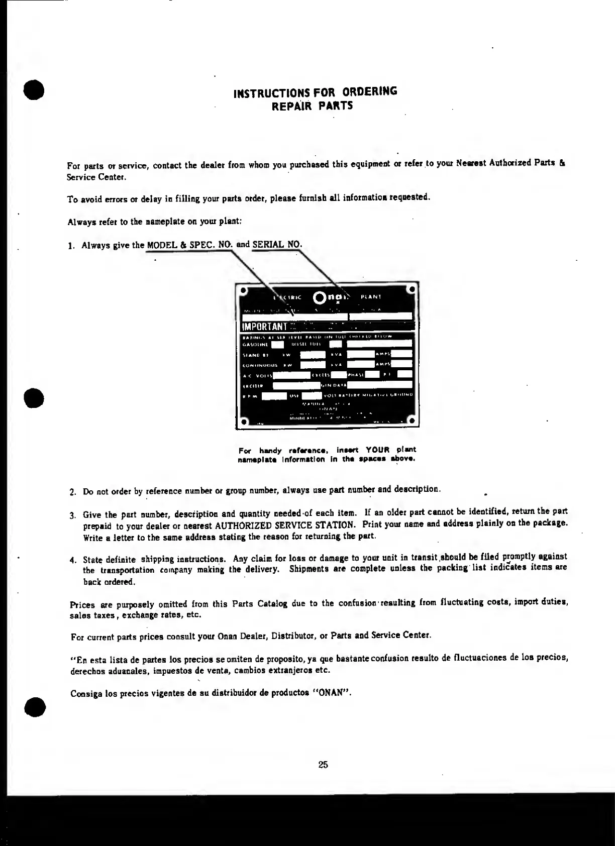 Onan MCCK - INSTRUCTIONS FOR ORDERING REPAIR PARTS