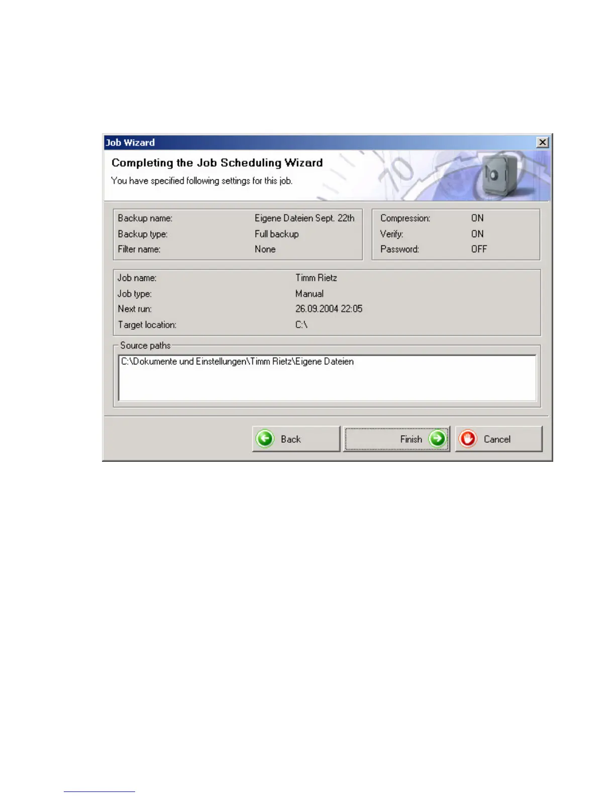 This screen shows a summary of the backup settings and the