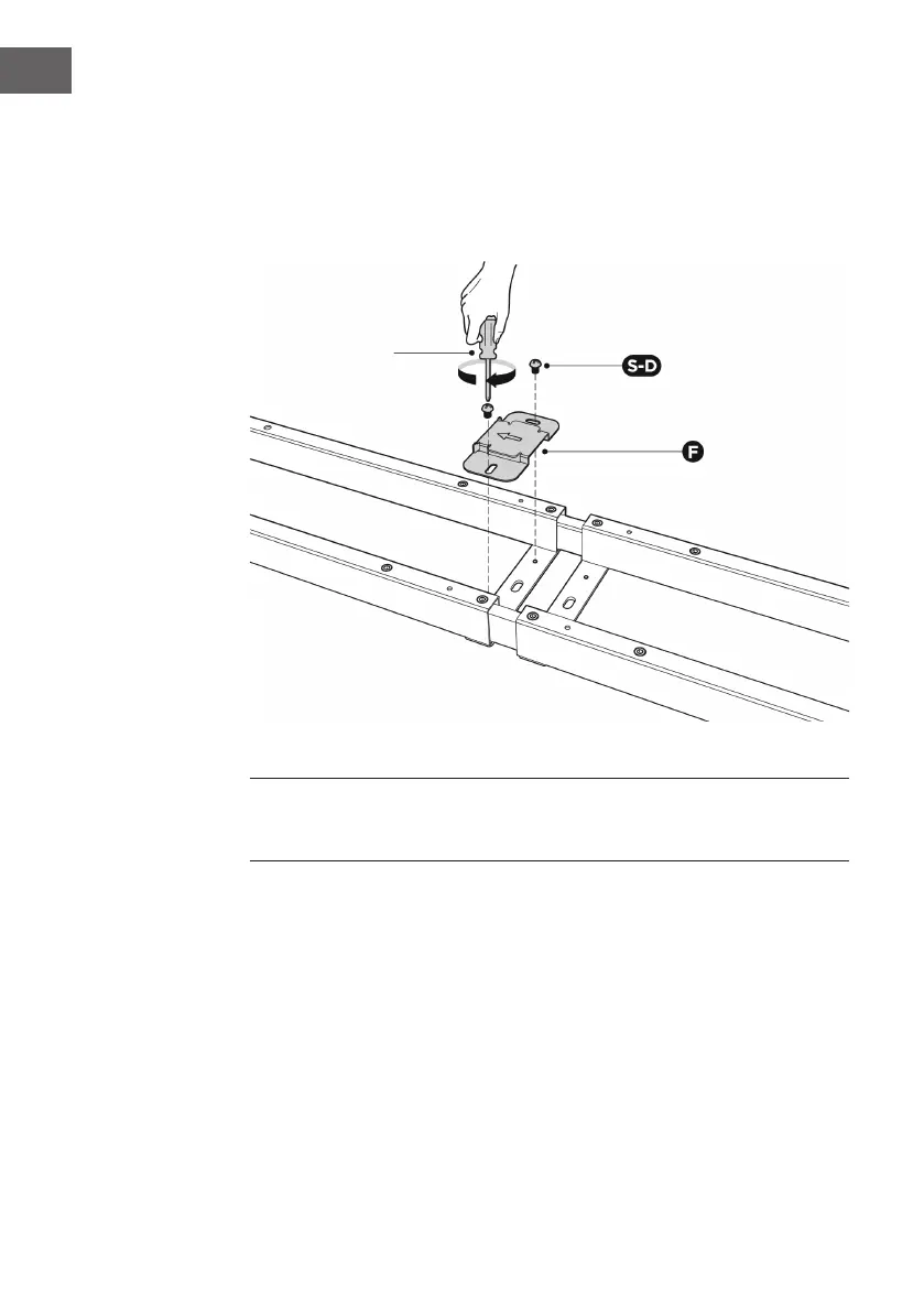 Attach the xing plate (F) on the center of the crossbar with 2 screws (S-D)