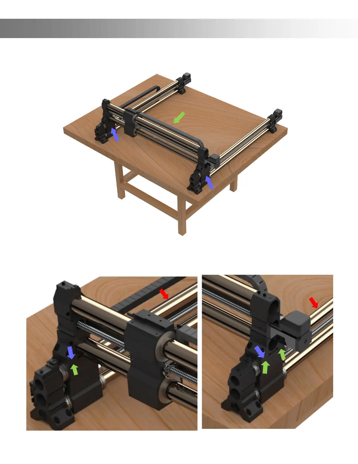 Step 3: Place the X-Rail (Green Arrow) on the Y-Rails Gantry Blocks (Blue Arrows)