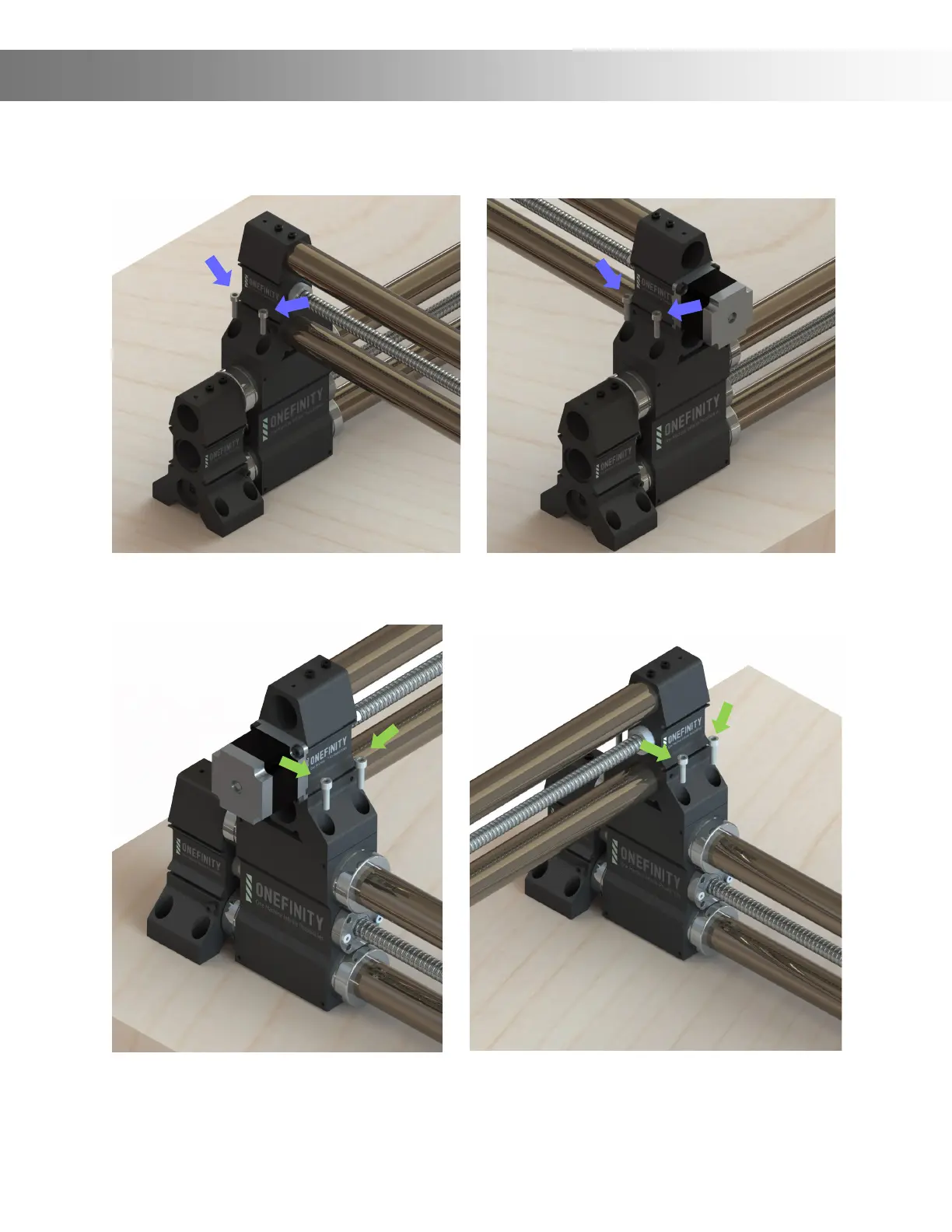 the front of the X-Rail to the Y-Axis using four (4) X-Rail Mounting Screws (Blue Arrows)