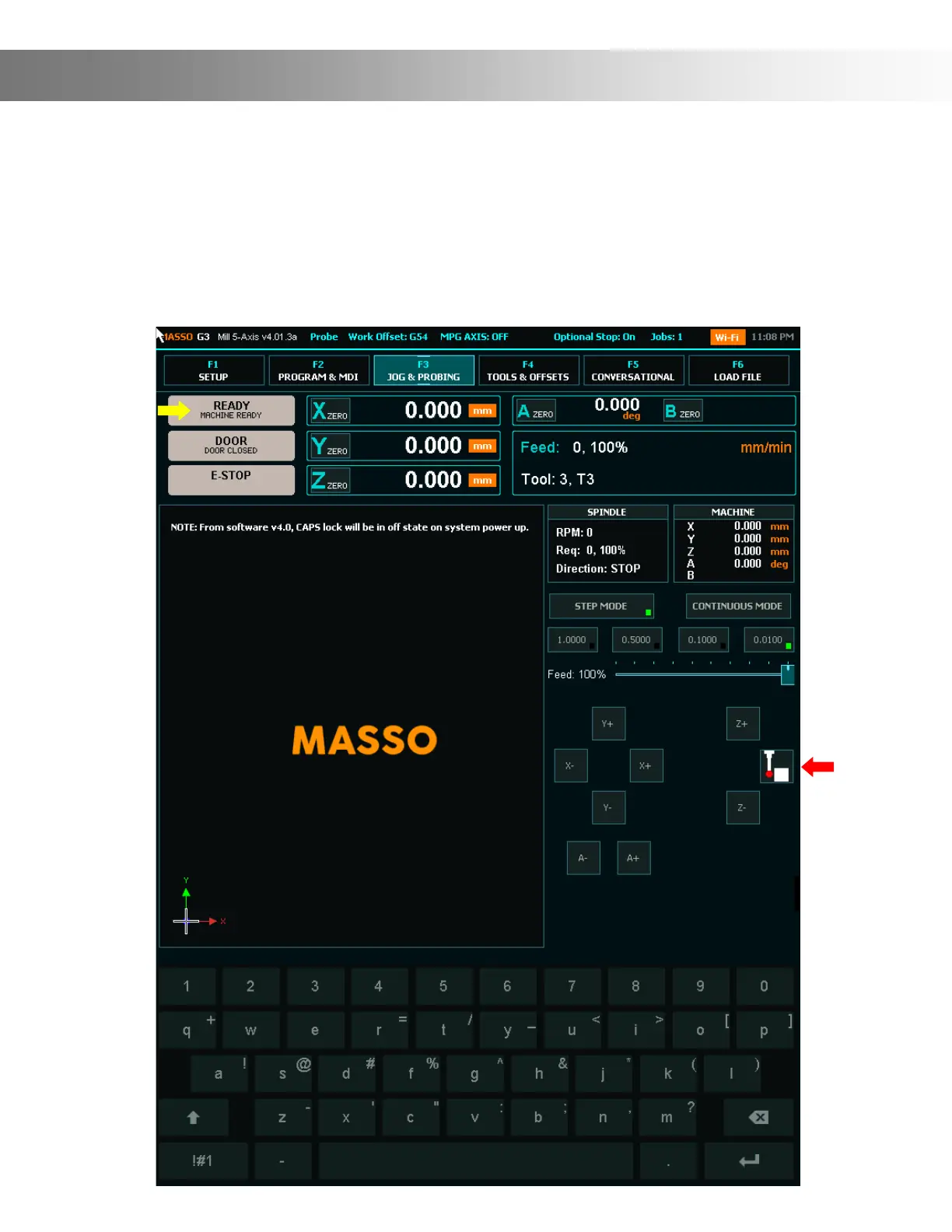 You can access MASSO probing functions by pressing the probing button on screen (Red Arrow)