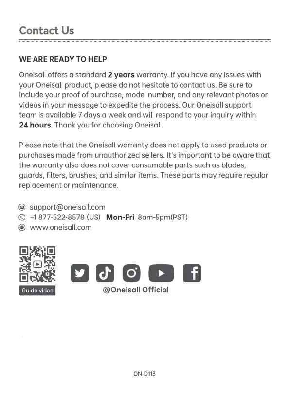 Oneisall offers a standard 2 years warranty. If you have any issues with
