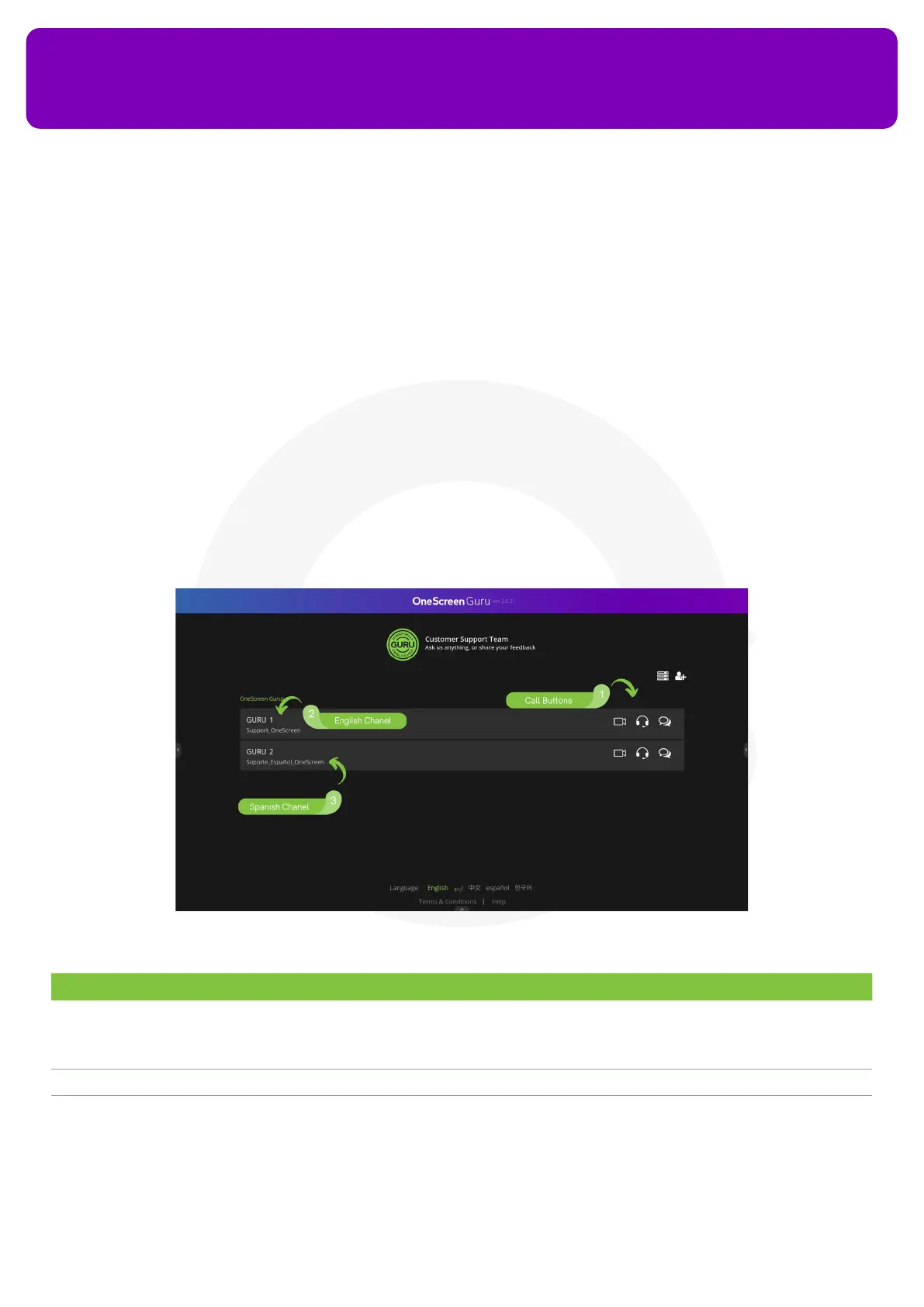 1. Call Buttons You can use these buttons to make Video/Audio Calls to the OneScreen Customer Support. You may
