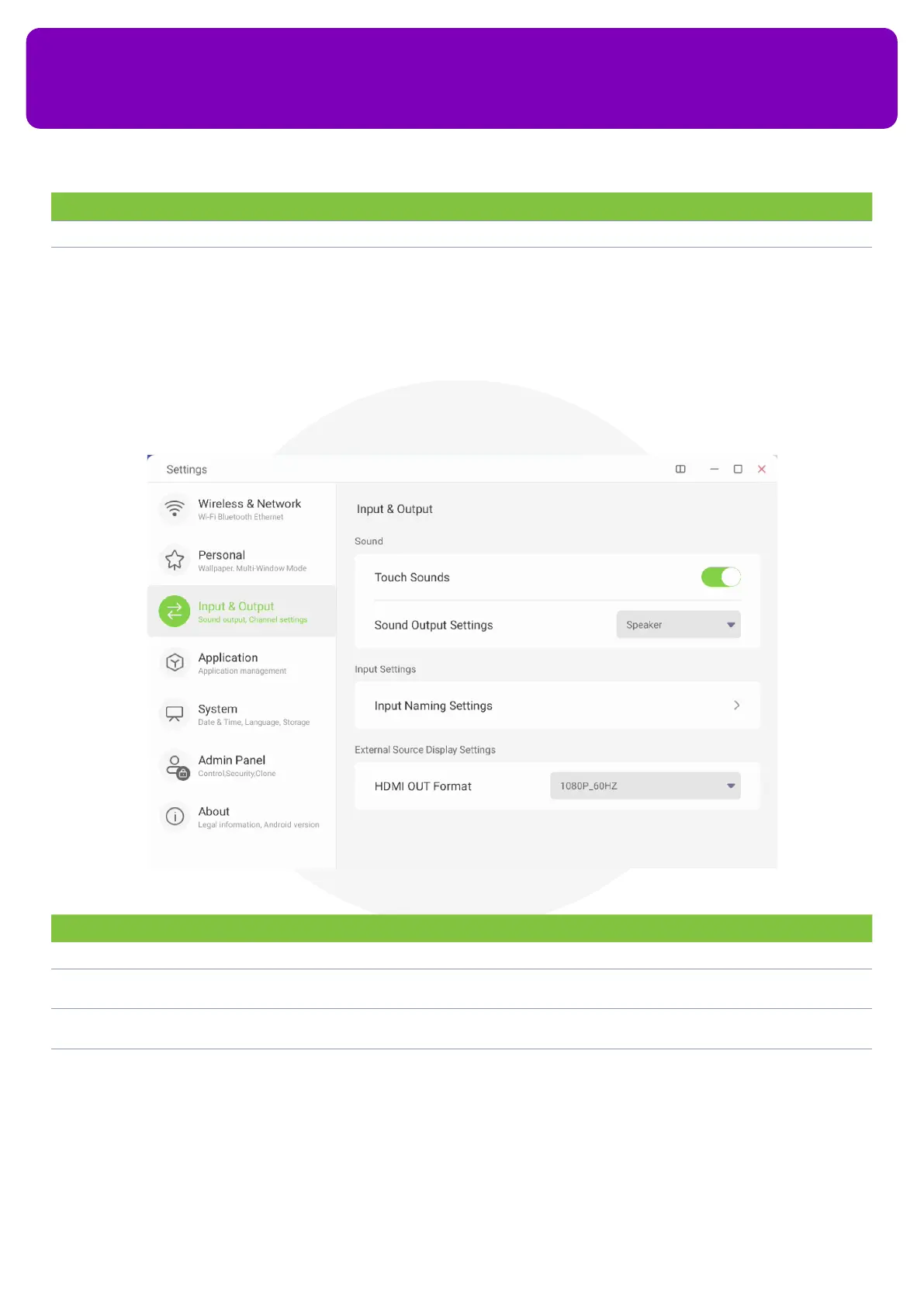Input and output settings allow you to congure all the inputs and outputs of your OneScreen like changing