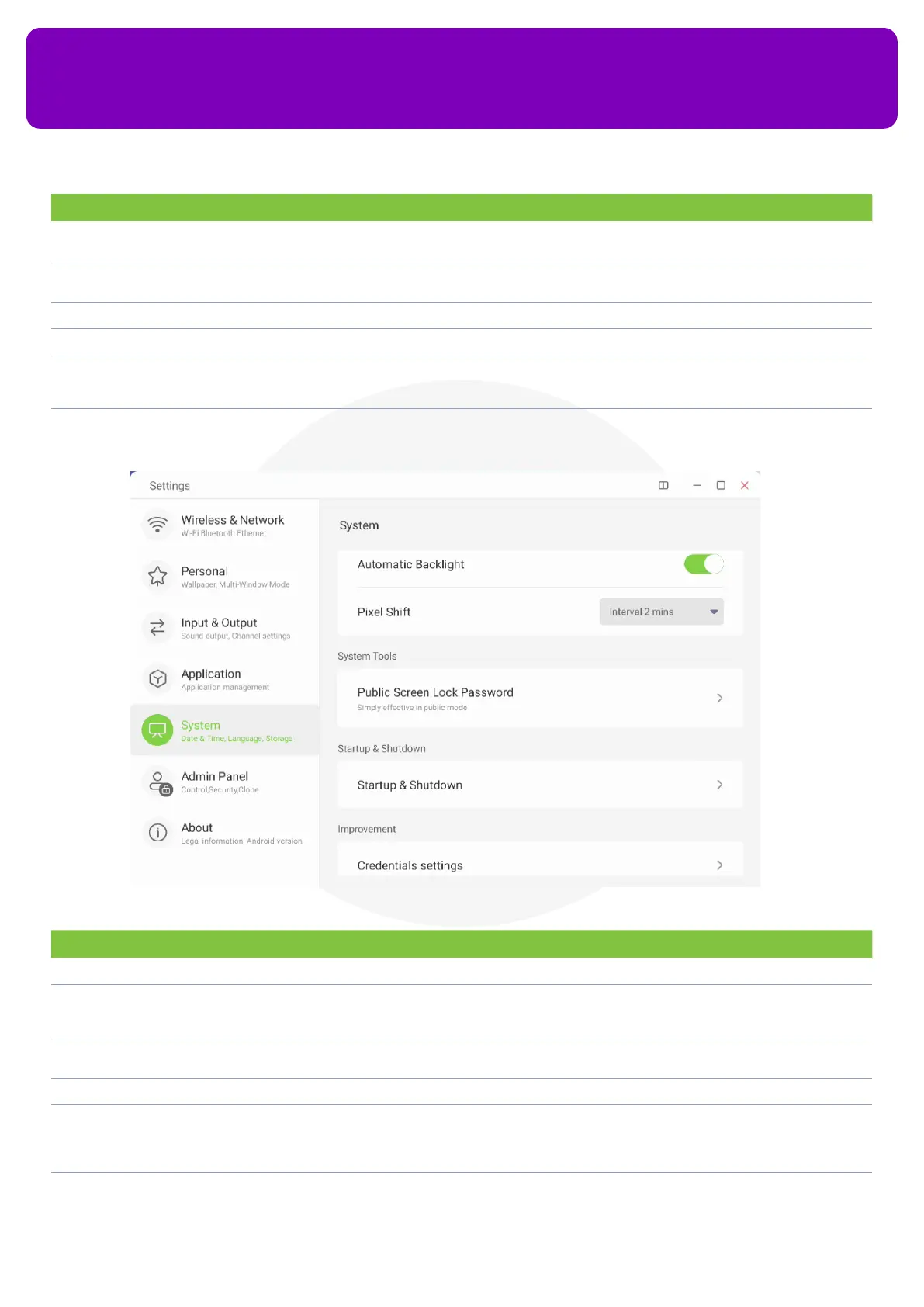 boot logo and animation, turn on energy saving settings such as Auto Standby and Auto Power O, Turn