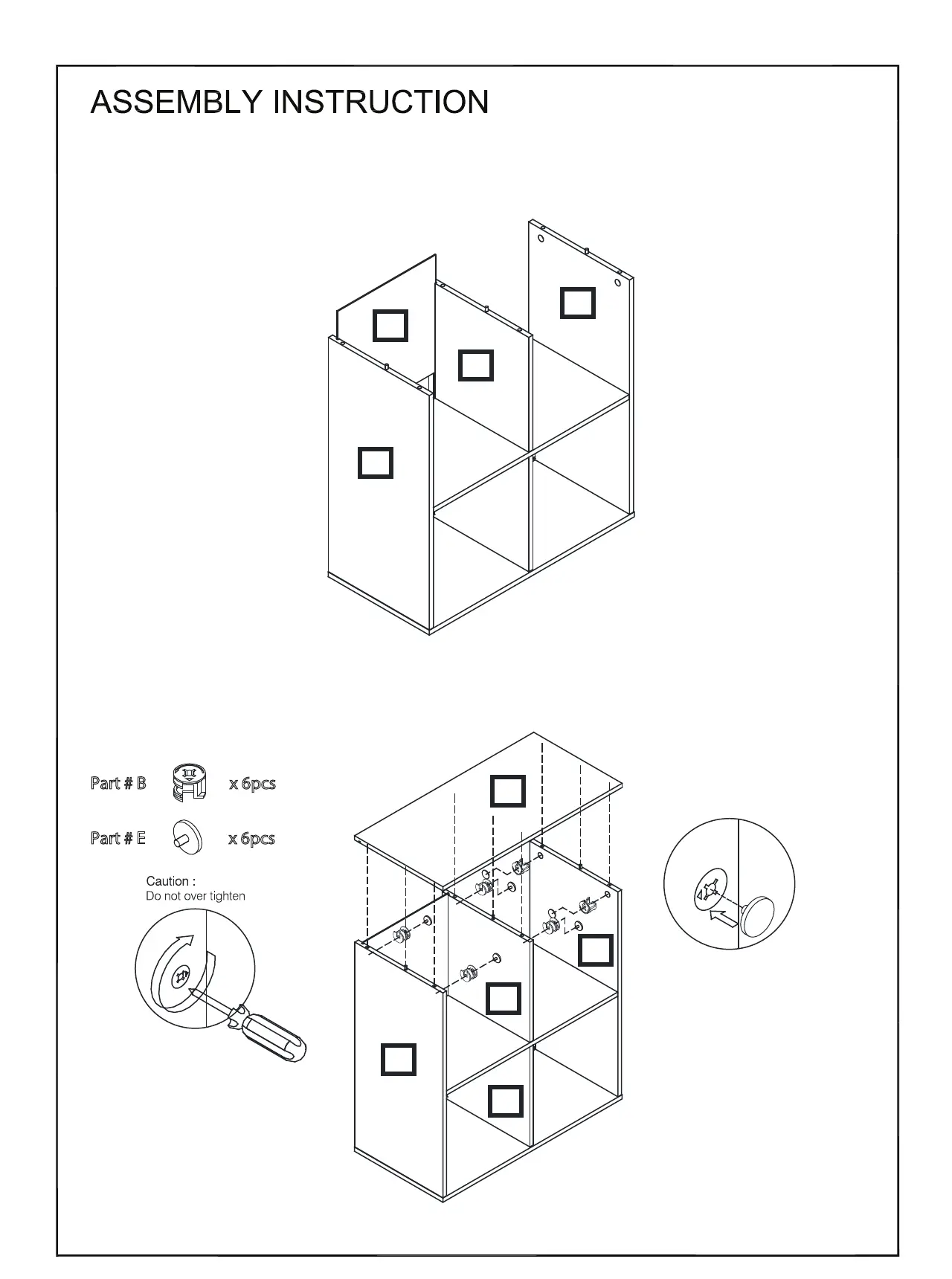 Insert the Minix Cams (B) into the Side Panel Left (1), Side Panel Right (2) and Center Panel Top (6)