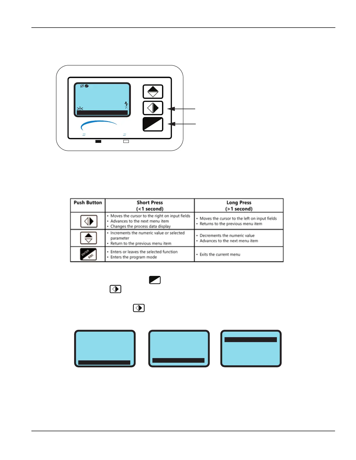 The FT-3200 transmitter is equipped with a lighted graphic display and 3-button user interface as shown below.