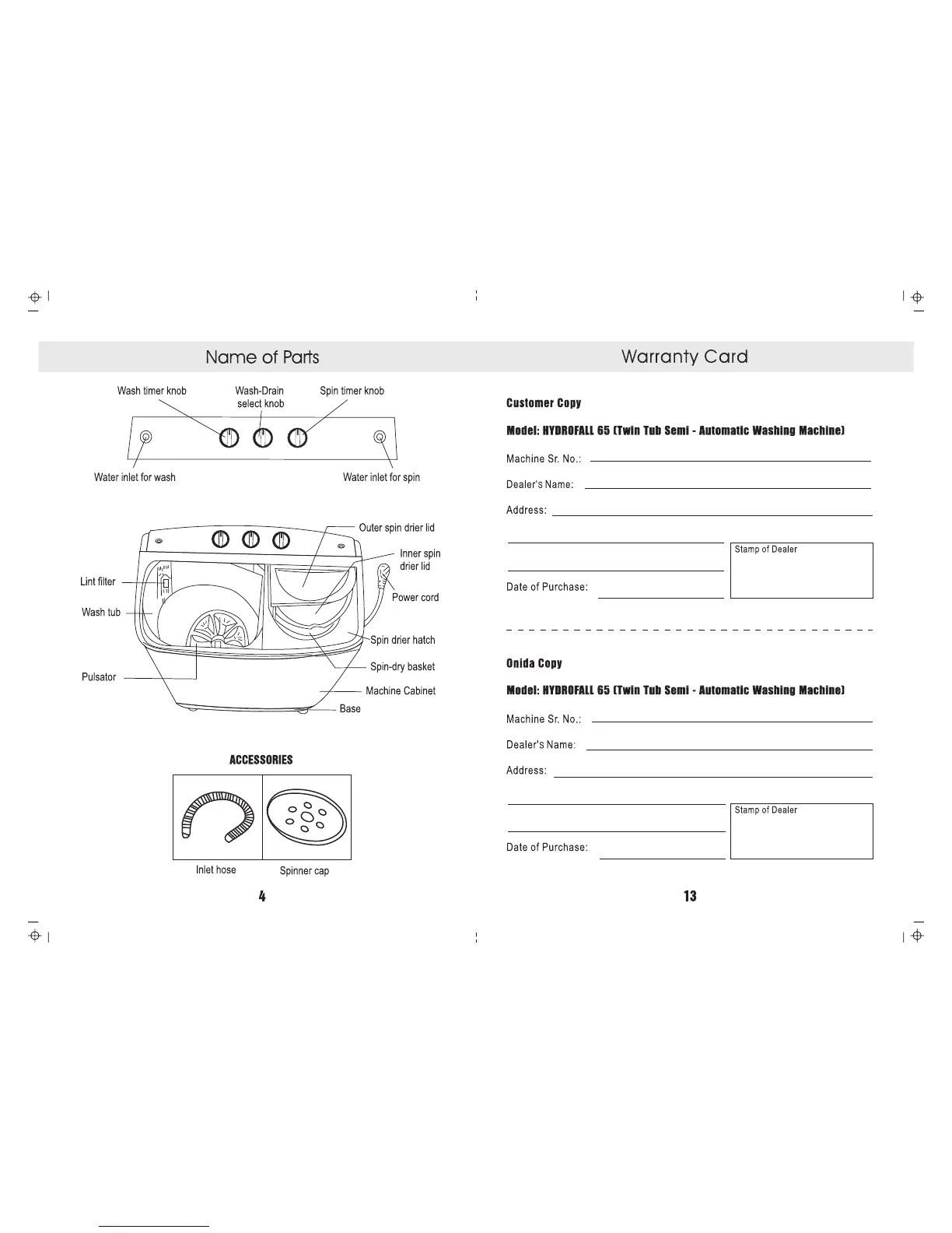 Onida Hydrofall 65 - Name of Parts; Warranty Information