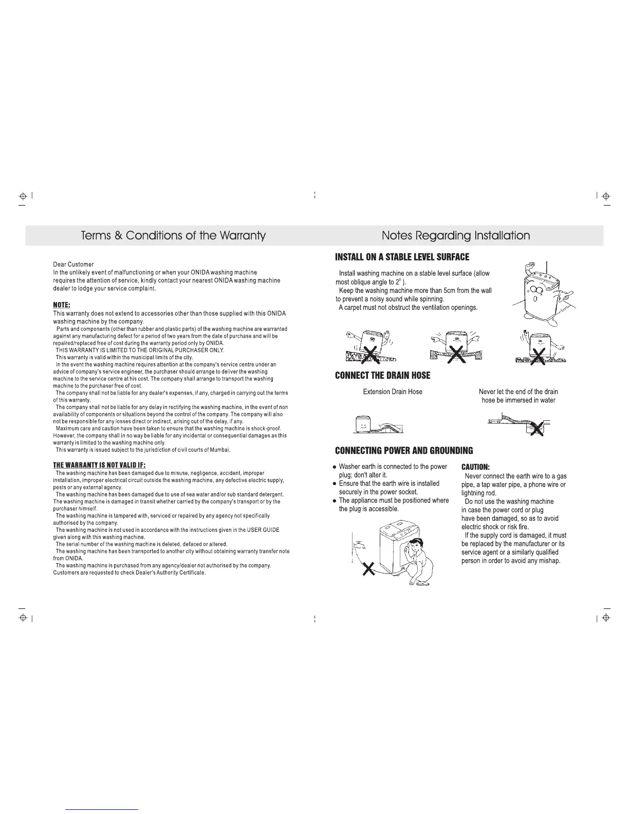 Onida Hydrofall 65 - Warranty Terms and Conditions; Installation Guidelines; Stable Level Surface Installation; Drain Hose Connection