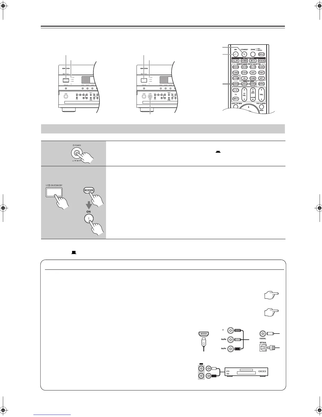 The AV receiver comes on, the display lights up, and the STANDBY indicator goes off.