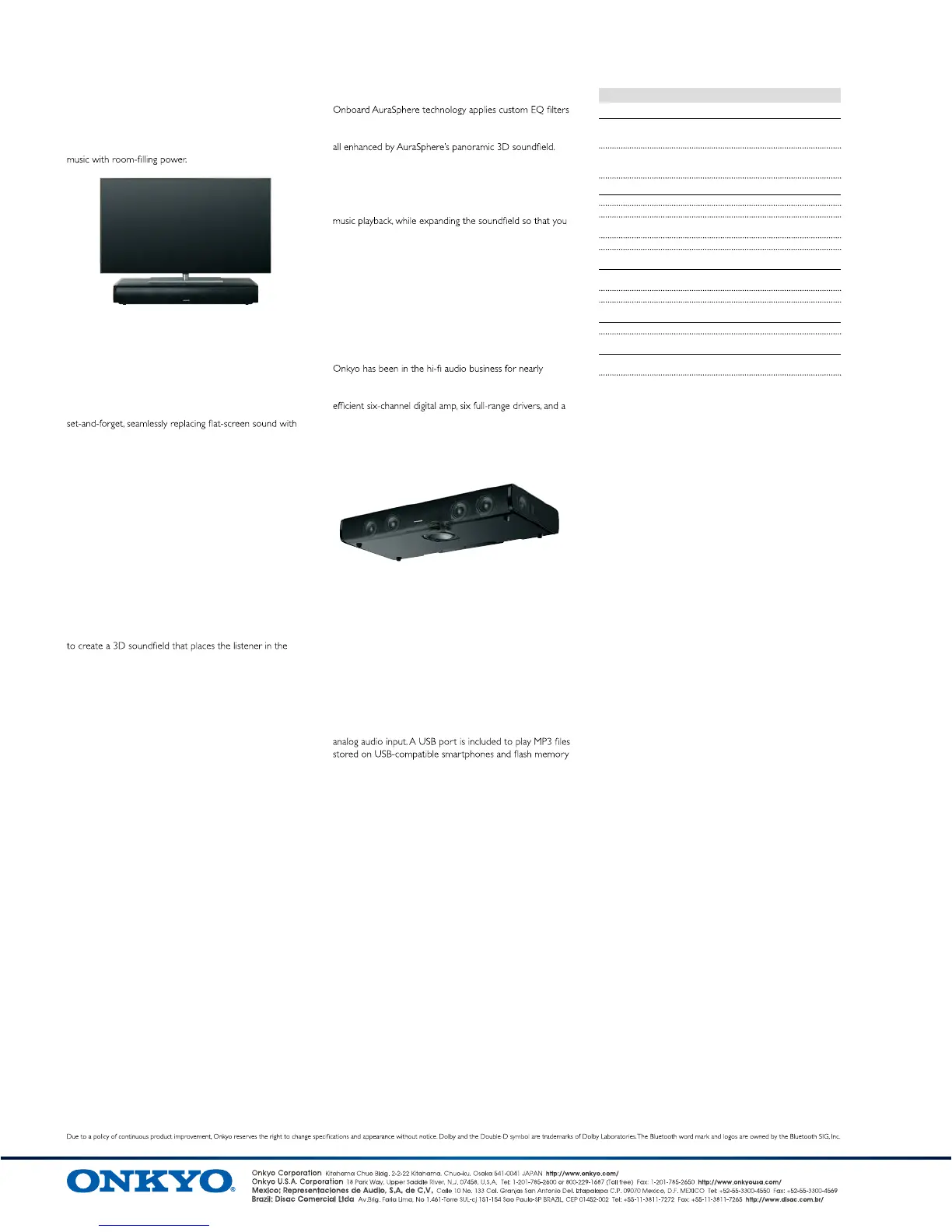 AuraSphere is a trademark of Onkyo Corporation and Sonic Emotion ag. AuraSphere is a listening experience technology developed jointly by Onkyo Corporation and Sonic Emotion ag. All other trademarks and registered trademarks are the property of their respective holders.