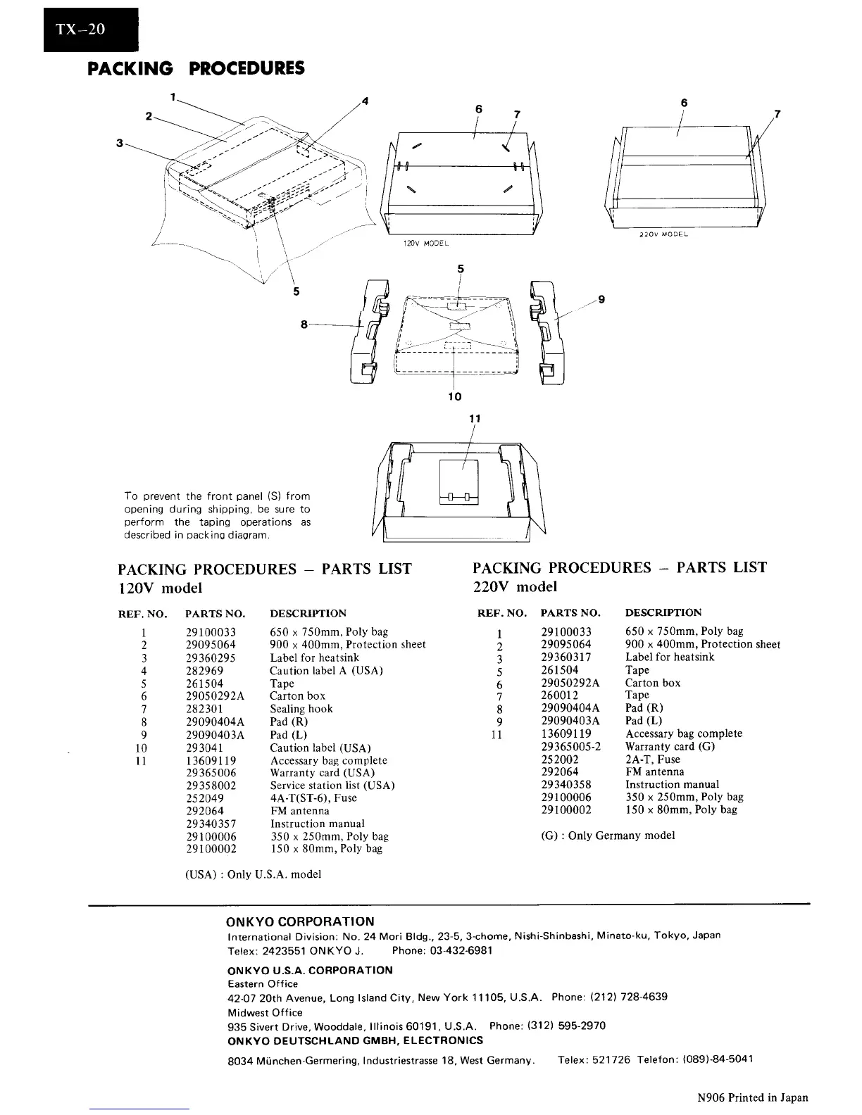 Onkyo TX-20 - Packing Procedures; 120 V Model Packing Procedures and Parts List; 220 V Model Packing Procedures and Parts List